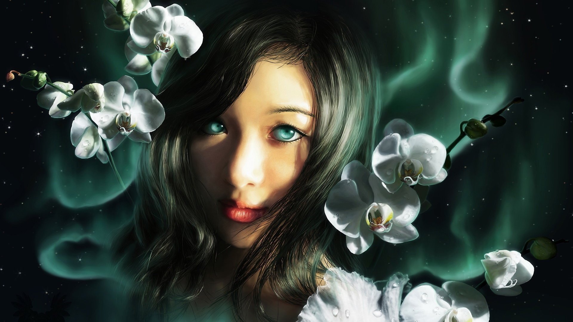 Image tags:unknown beauty, blue eyes, dark hair, orchids, northern lights, girl