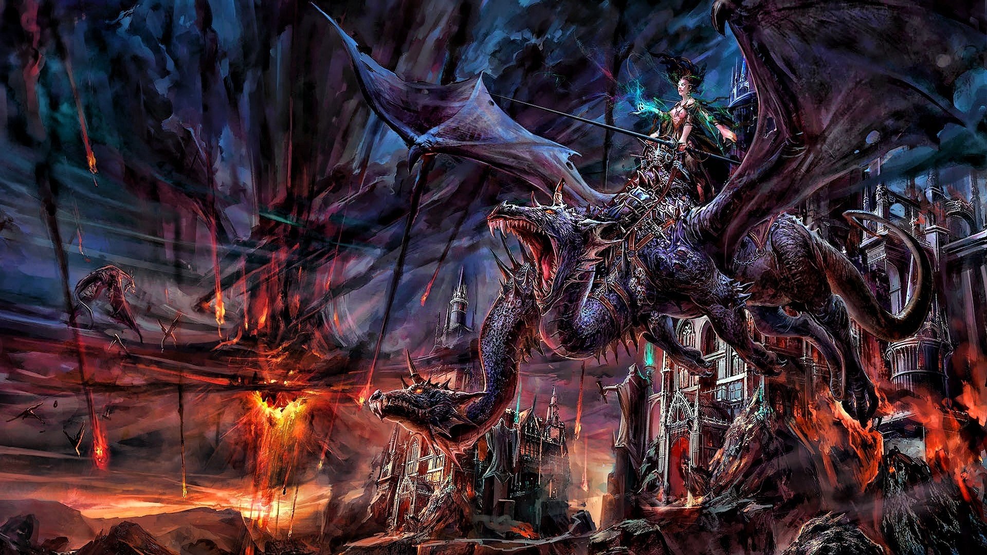 Drawing of a two-headed dragon with a rider among flames and a castle