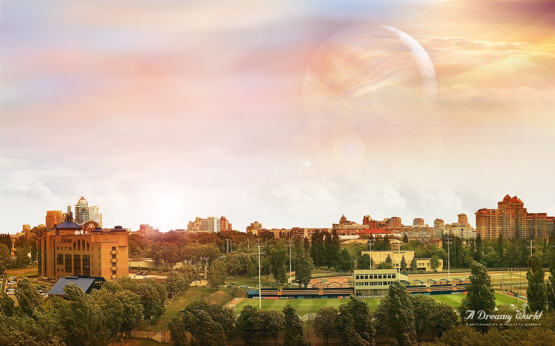 Purple pink sky over a green city