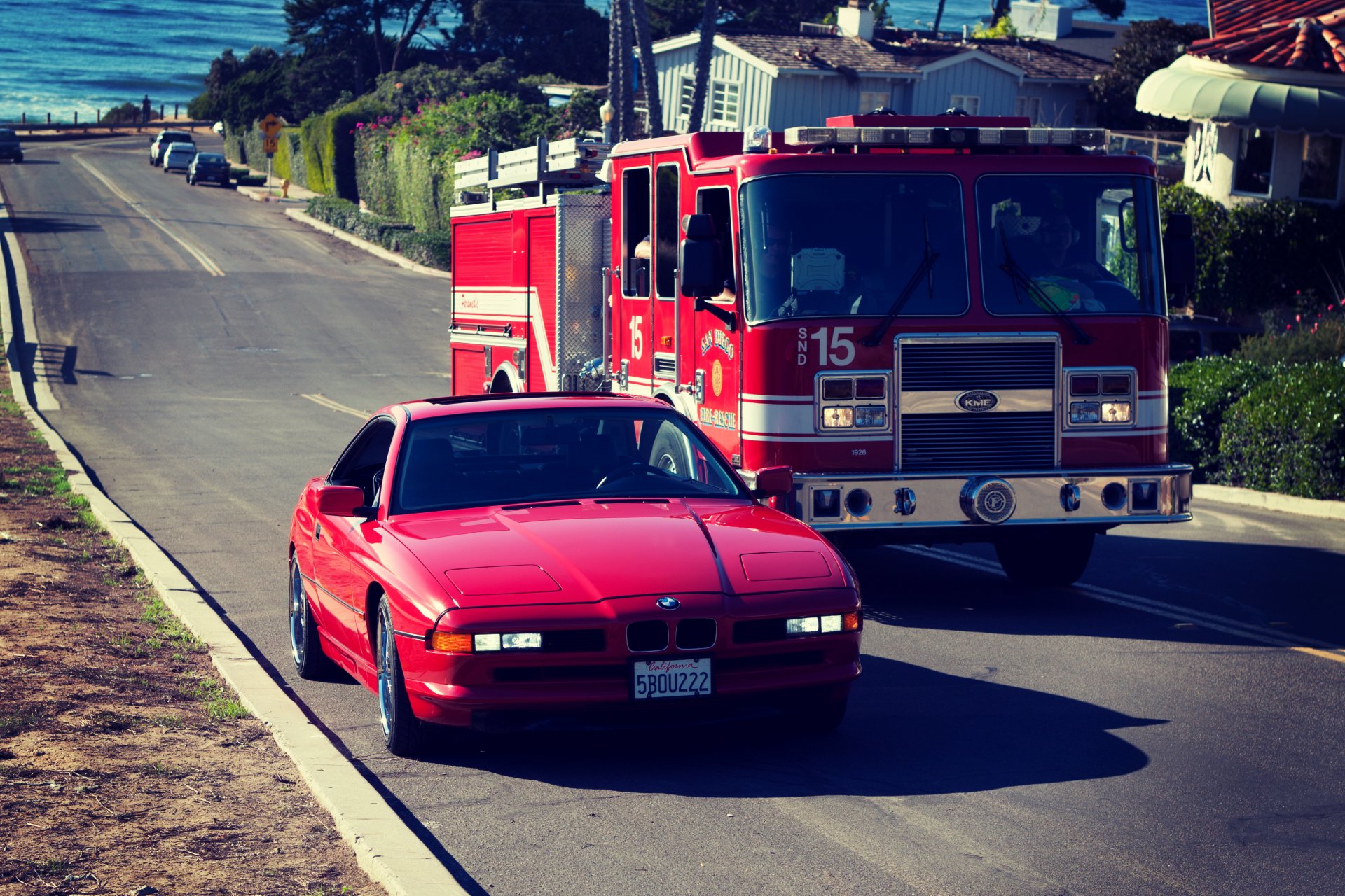 A red BMW car is driving next to a fire truck on the road