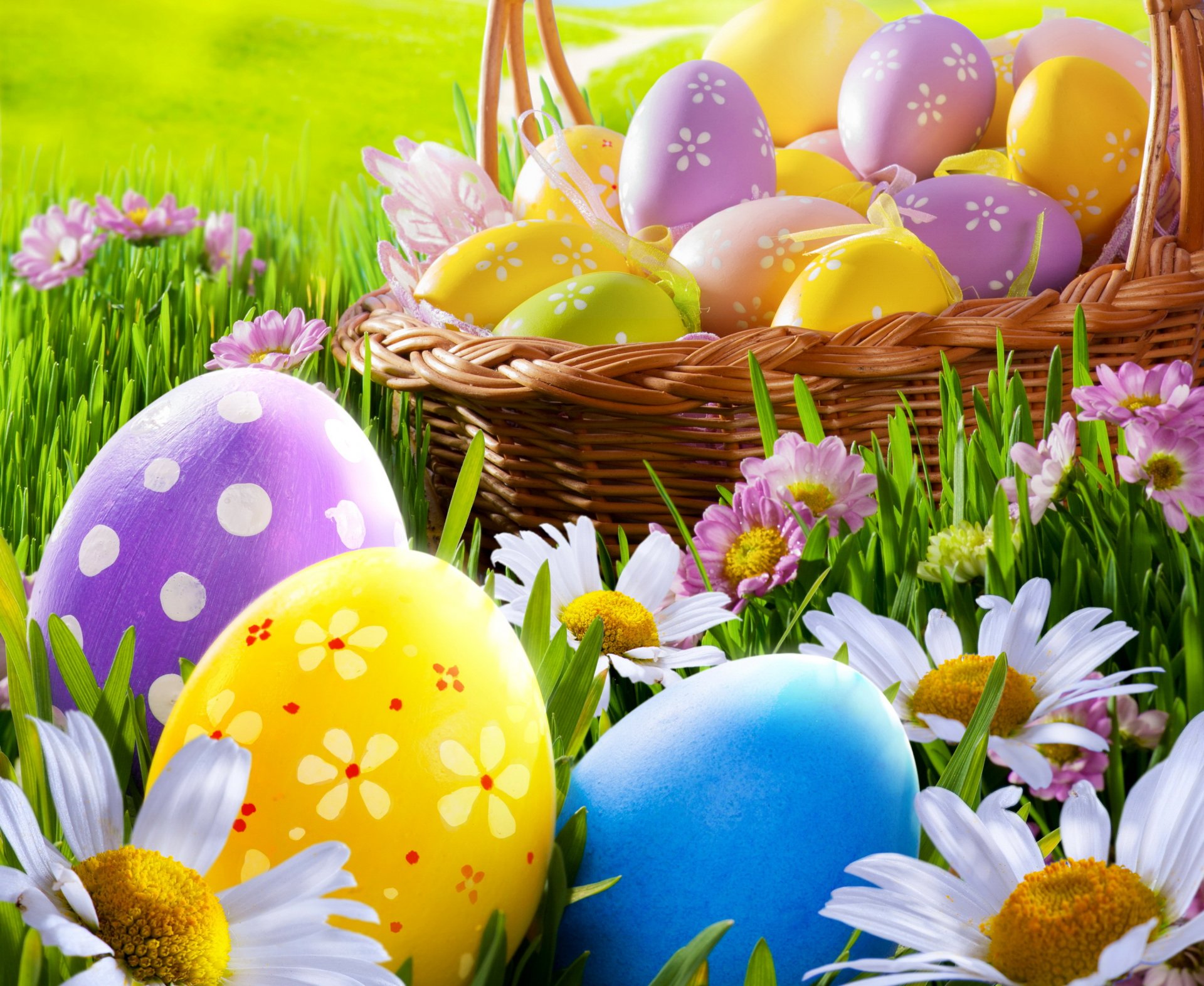 Easter basket on the chamomile meadow