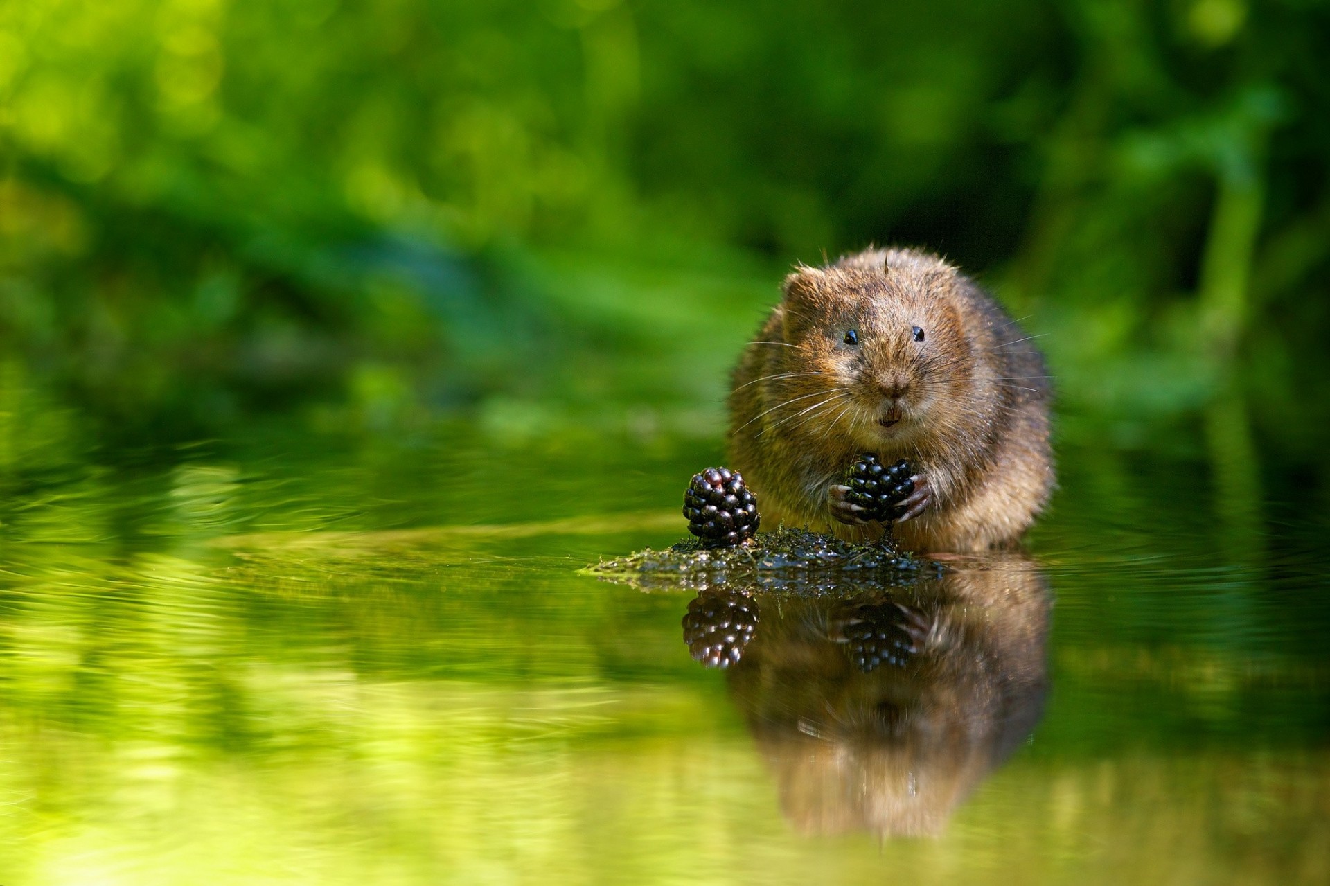 A water vole eats berries on an island in the middle of the river