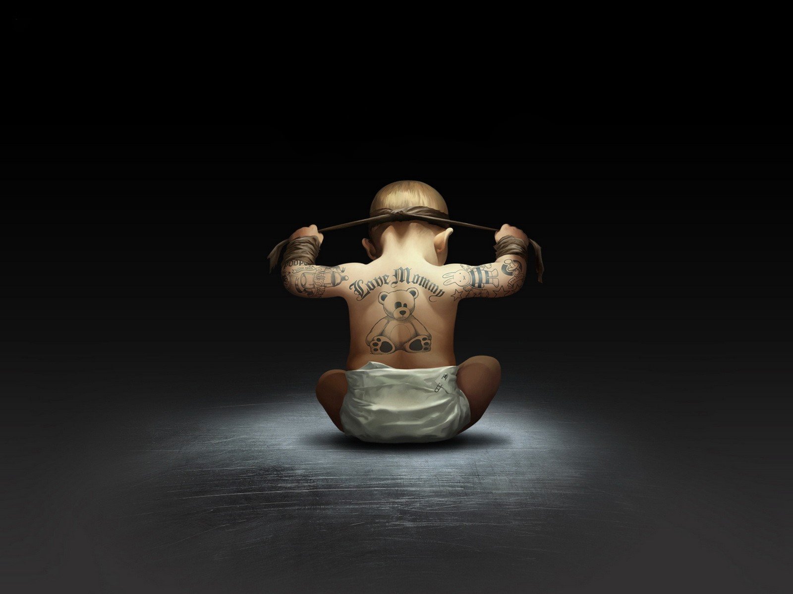 A little kid with tattoos in a diaper