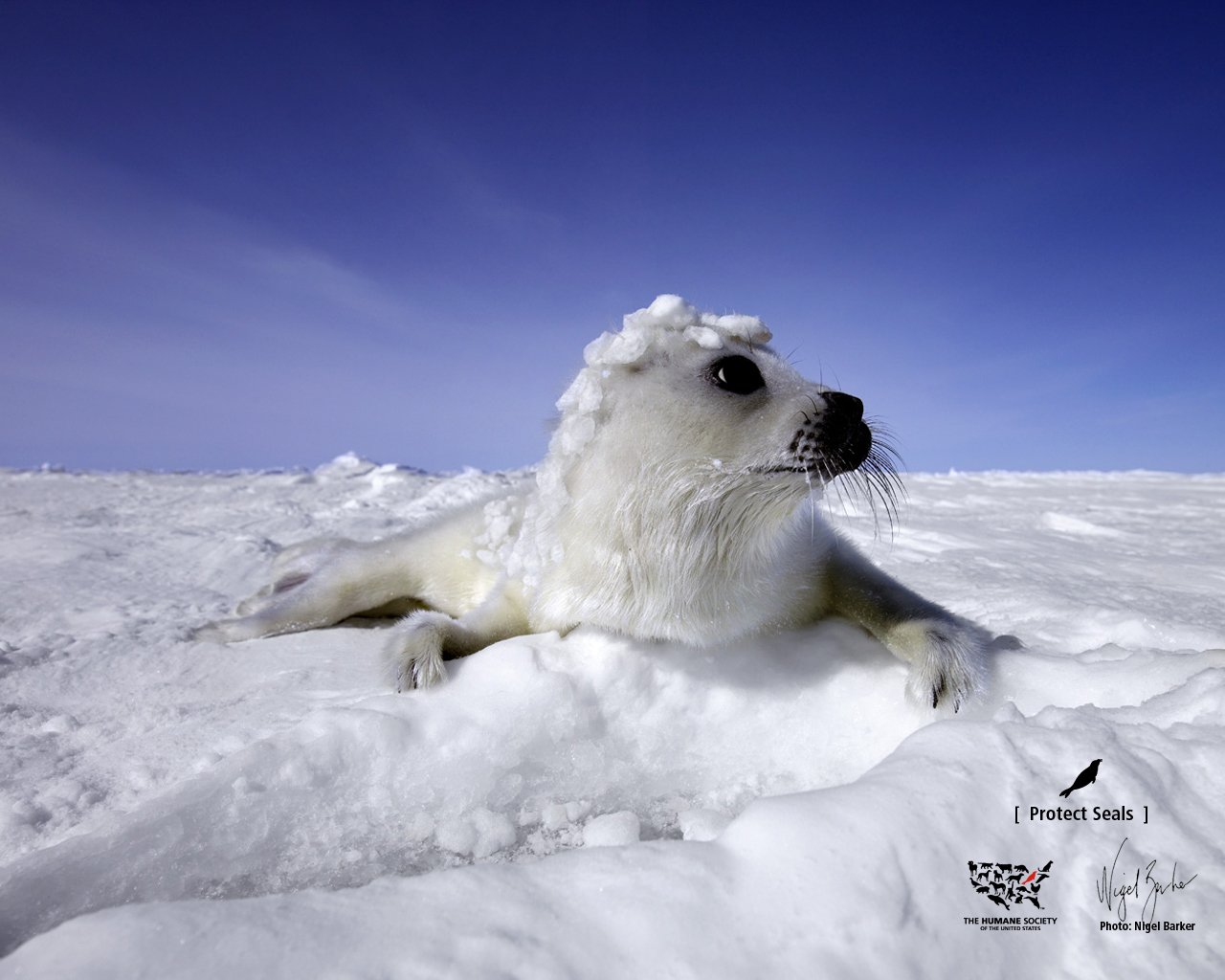 Cute navy seal is lying on the white snow