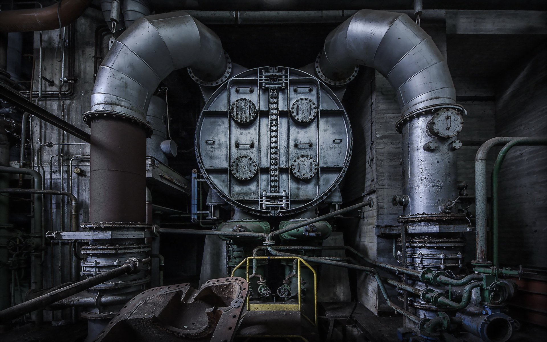 Gray creepy factory with pipes