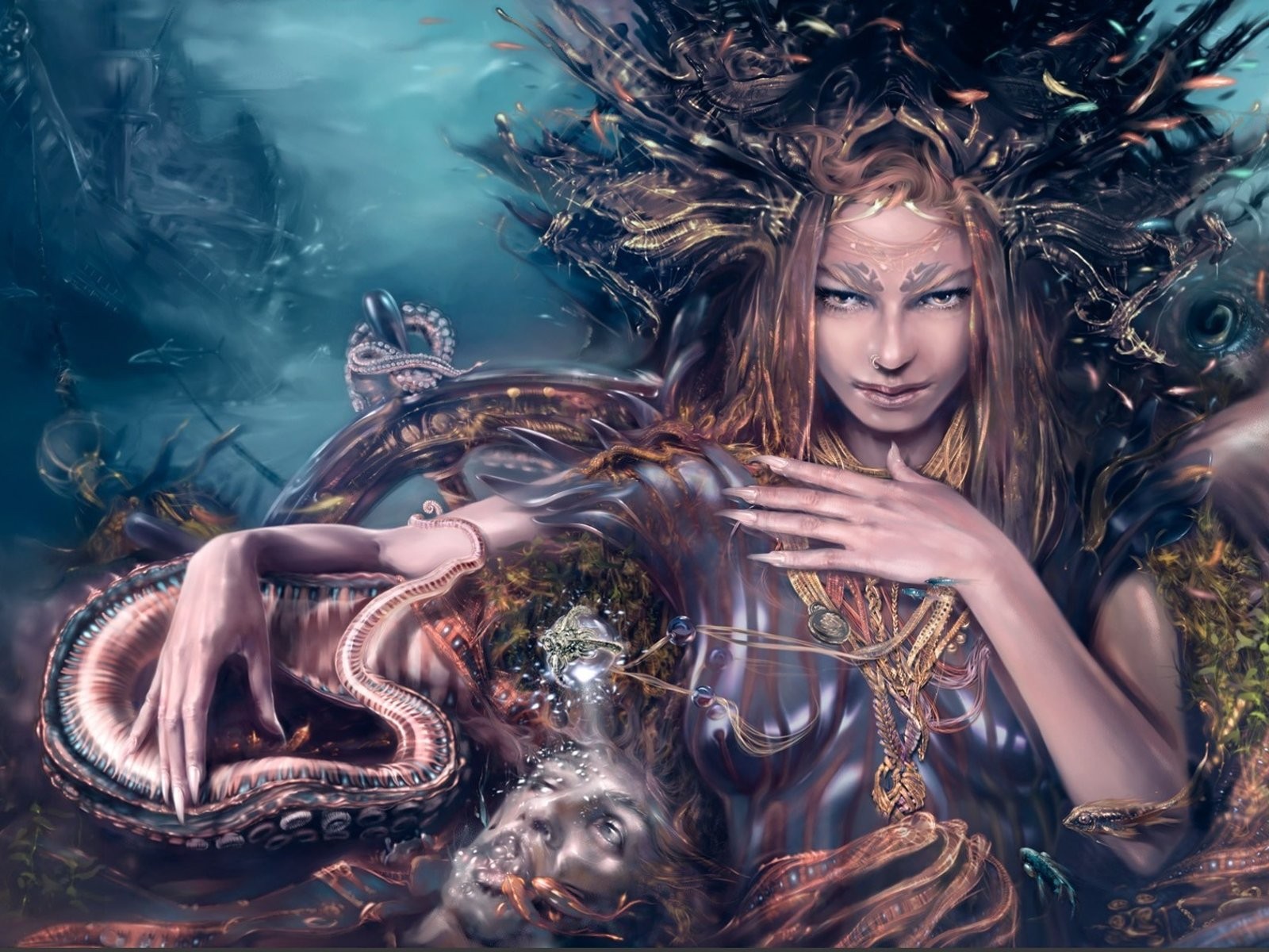 Image tags:fantasy, sea, the bottom, mistress, ship, octopus