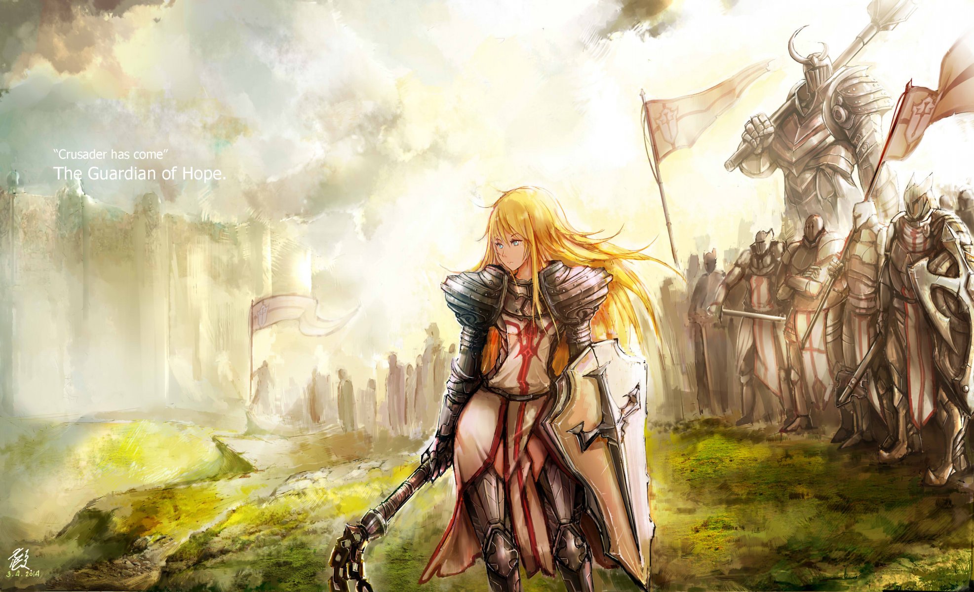 Image tags:fiction, art, girl, armour, weapon, shield, view, army, bully, hammer