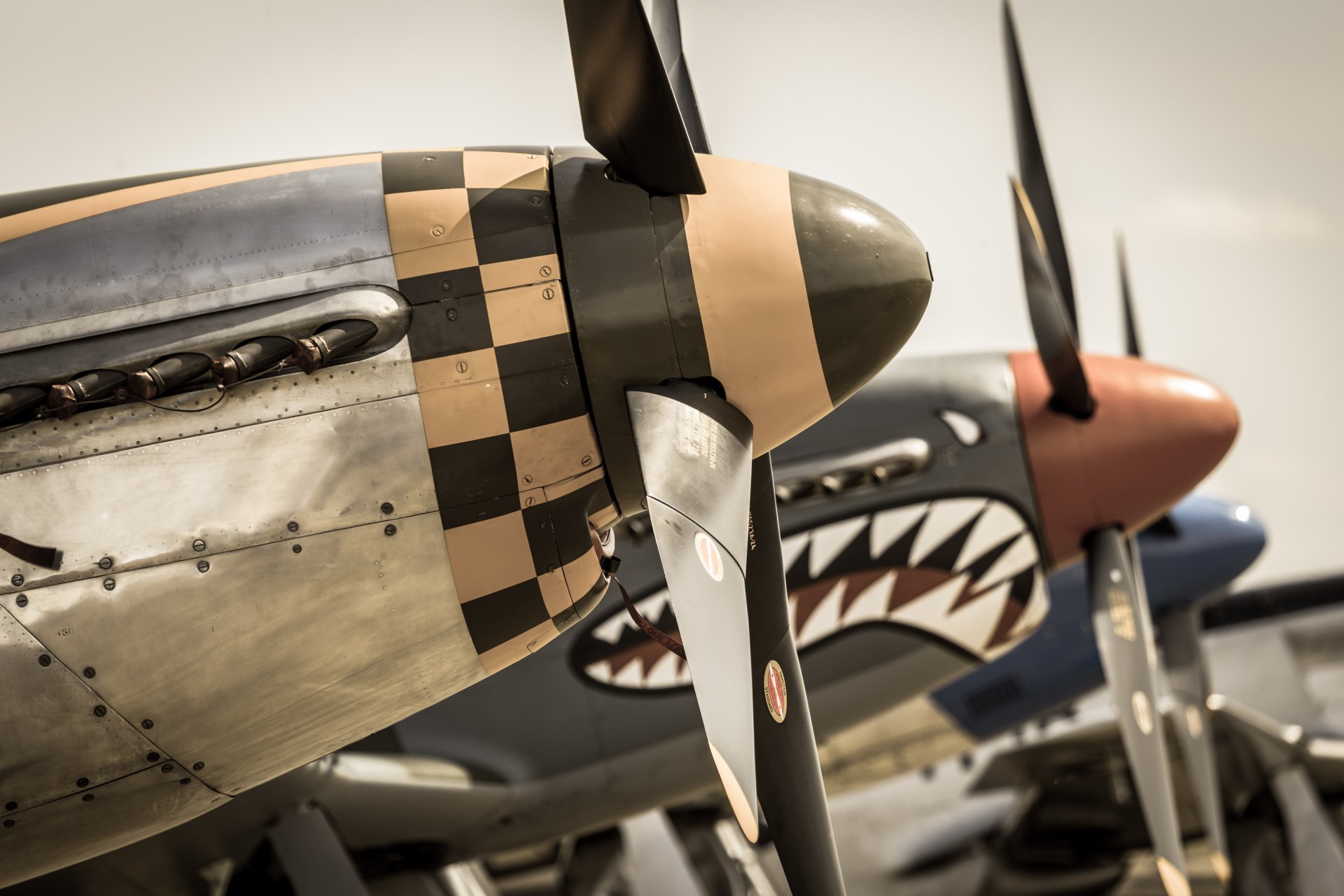There are beautiful fighters with powerful propellers at the airfield
