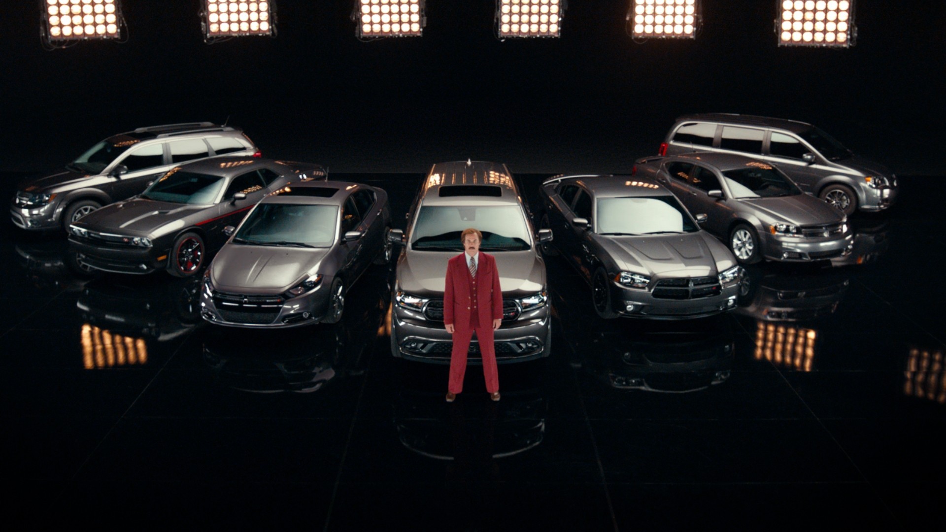 Seven cars of the same color and a man in a red suit