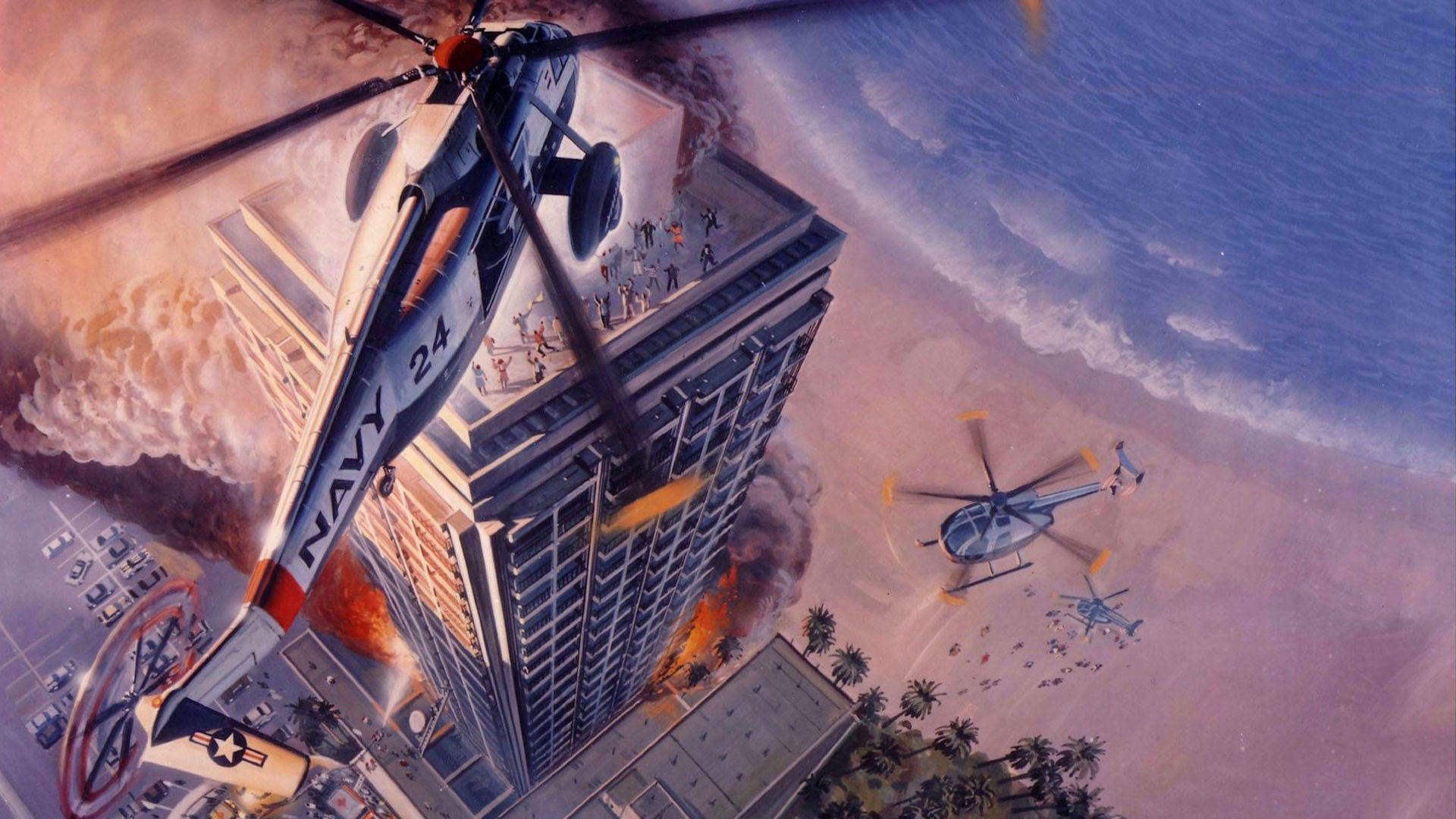 Drawing of a burning skyscraper with people on the roof