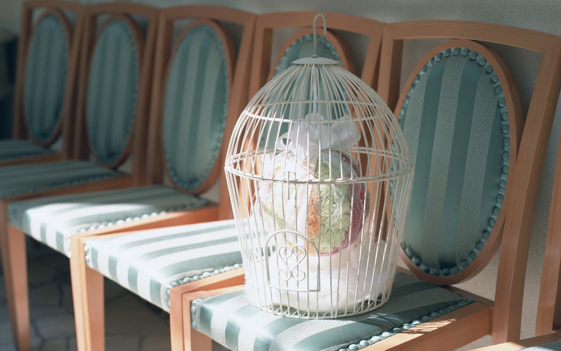 Wedding bouquet in a cage on a striped chair