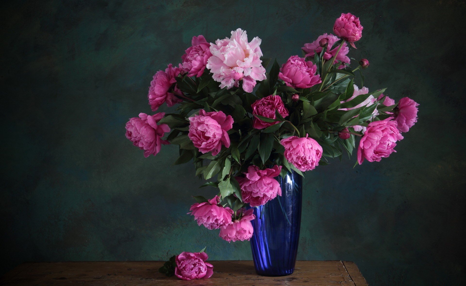 A bouquet consisting of pink peonies standing in a blue vase