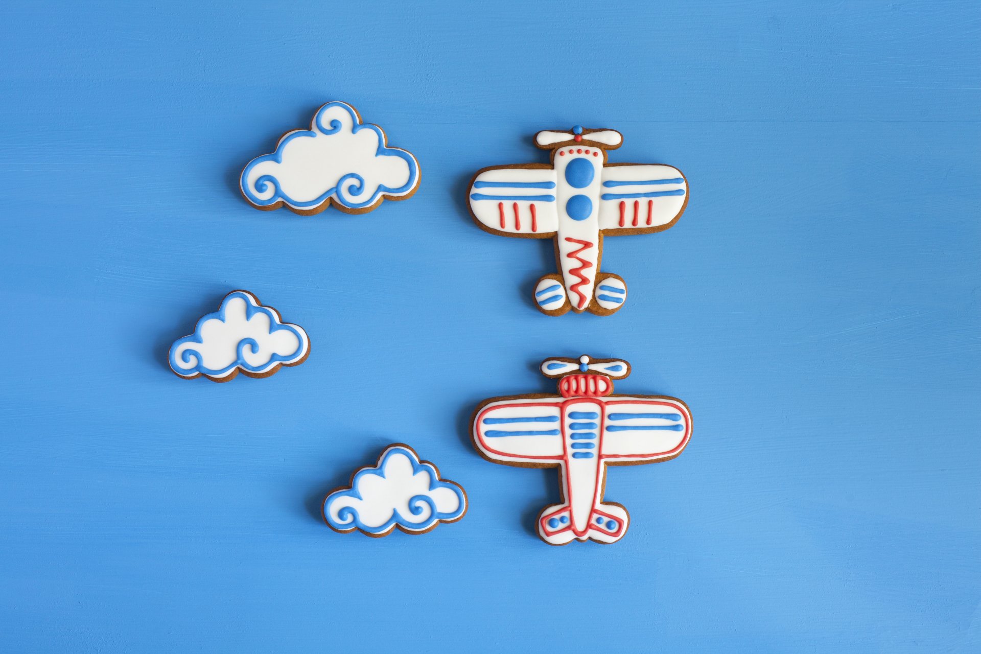 Image tags:food, dessert, baking, gingerbread shaped, glaze, planes, clouds, house, natural products, table, yum-yum, blur, bokeh, wallpaper.