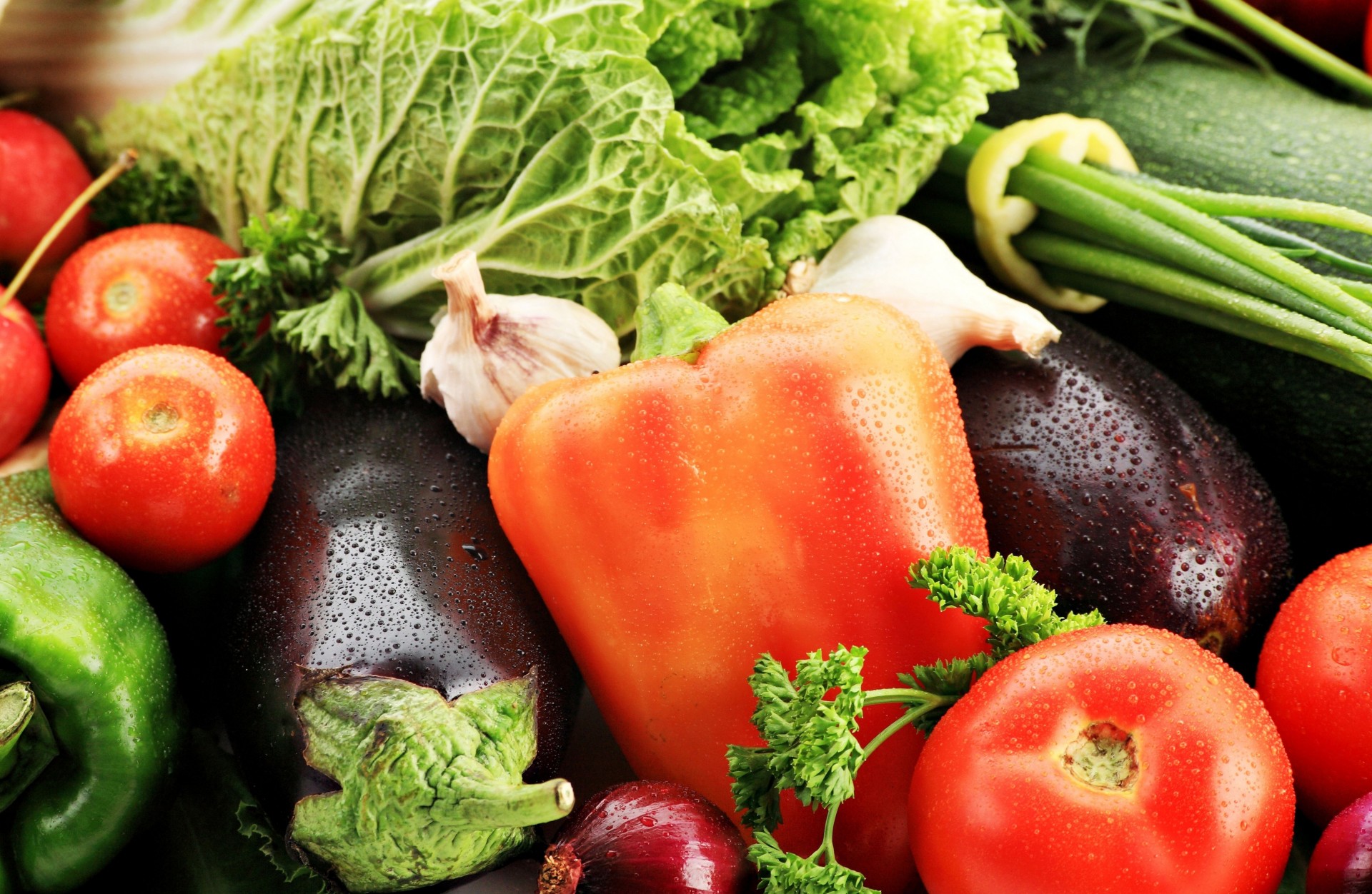 Cabbage and vegetables in drops of water