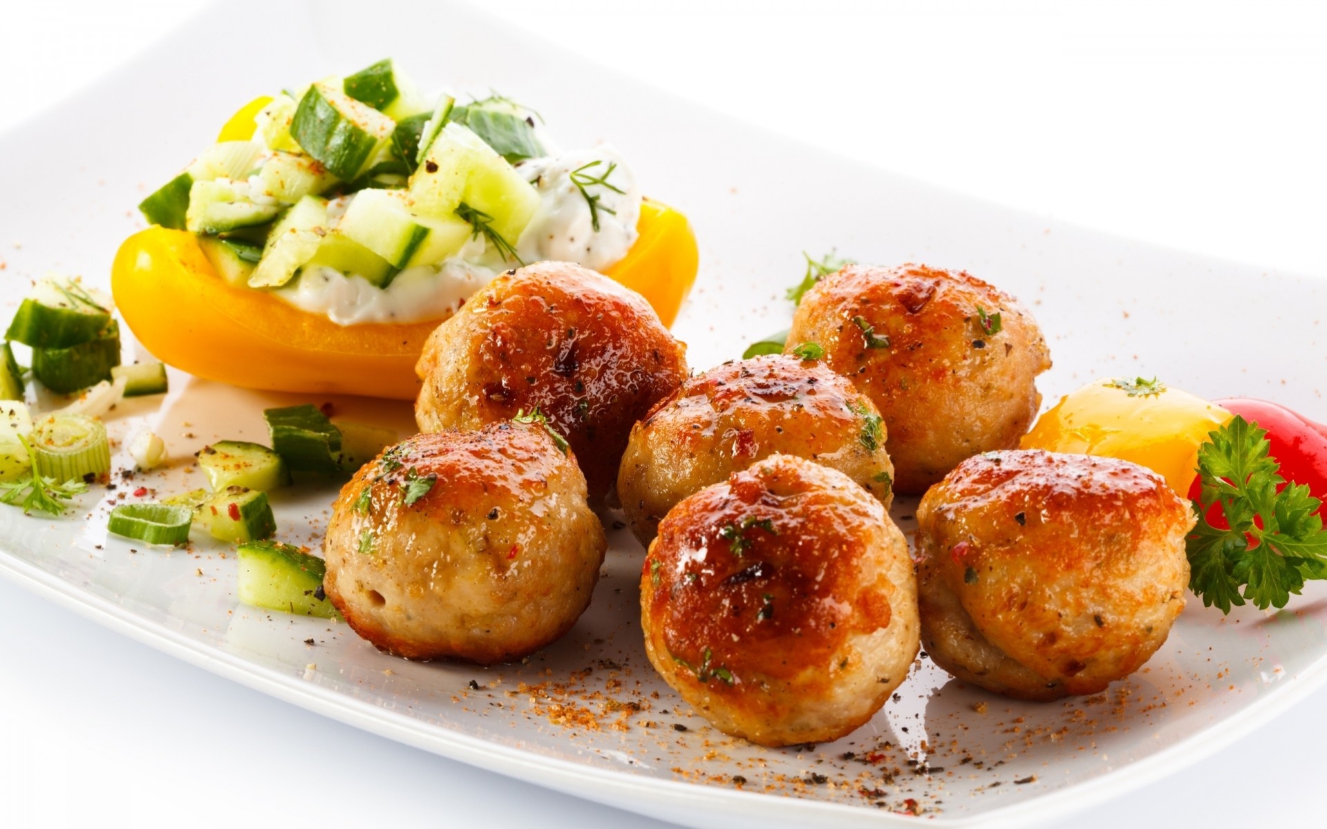 Meatballs with vegetables baked on a white plate