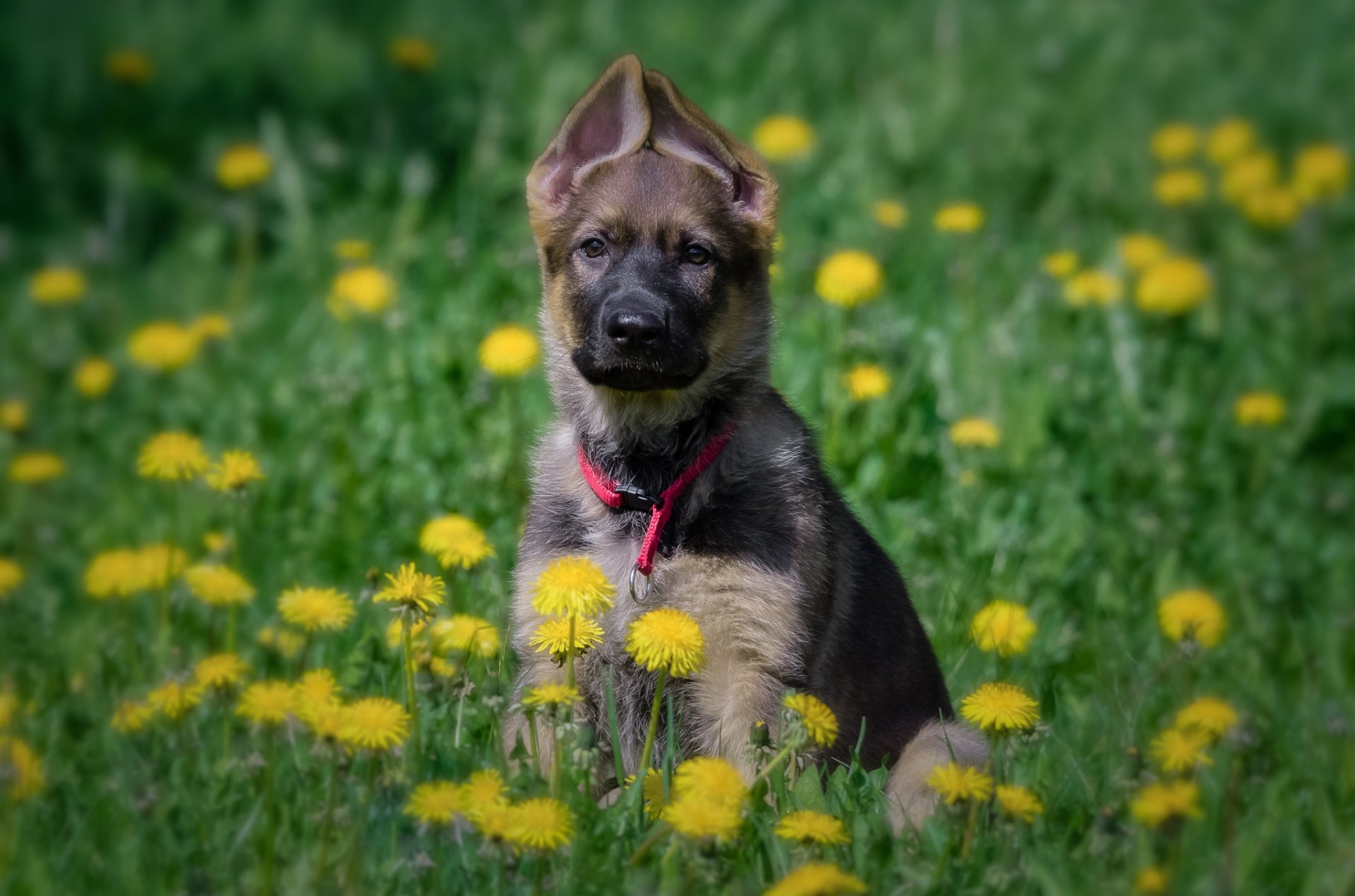 A German Shepherd puppy is sitting in a meadow with dandelions with raised ears