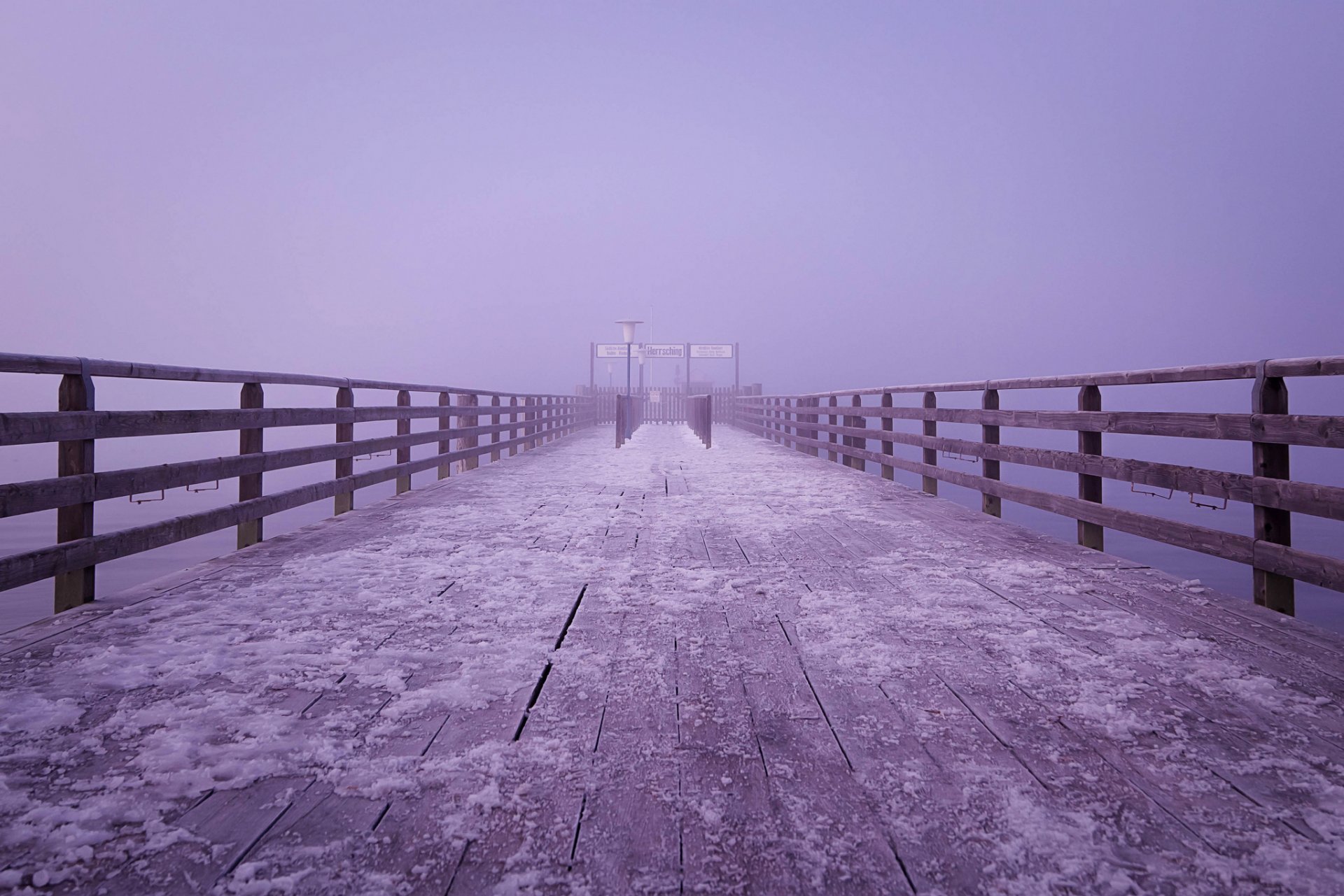 A lilac mist descended on a wooden bridge covered with snow