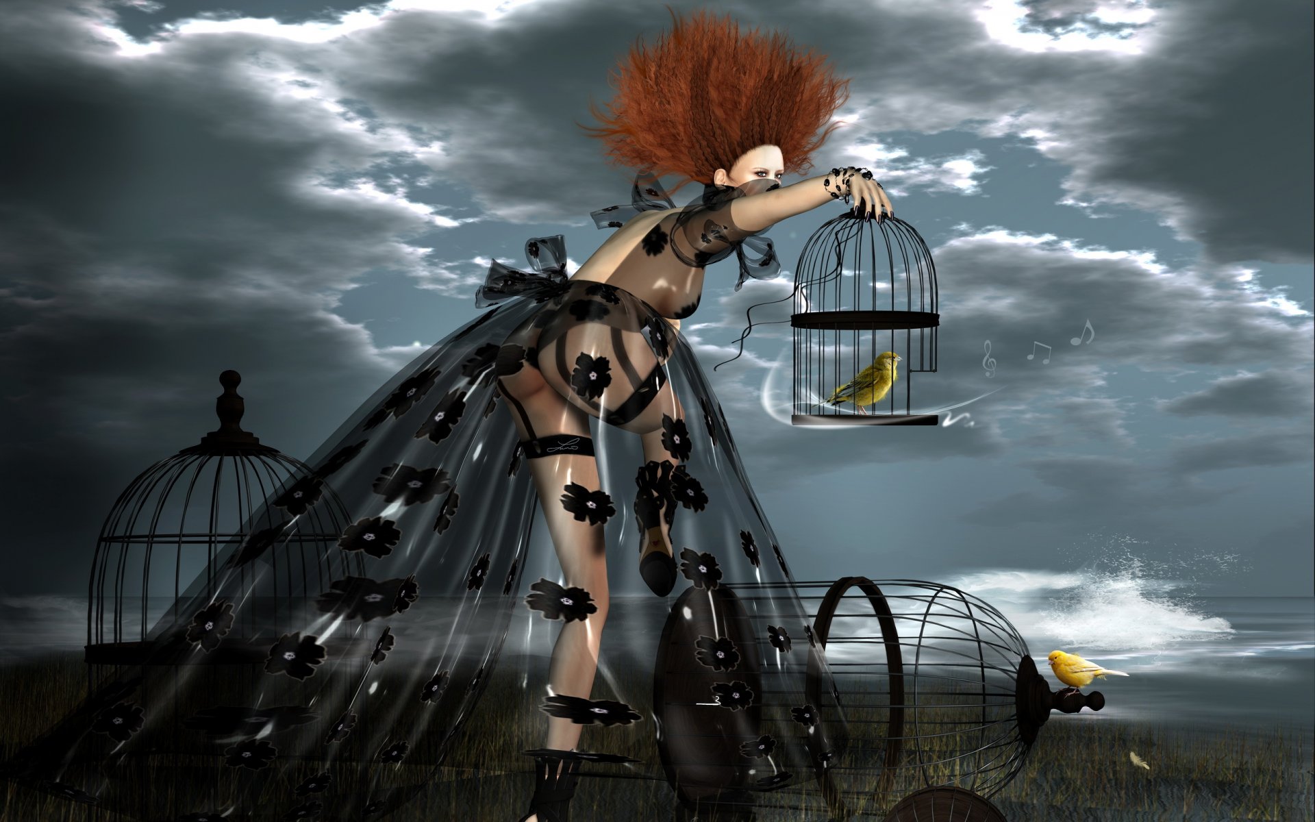 A woman standing in a transparent dress and holding one of the canaries in a cage