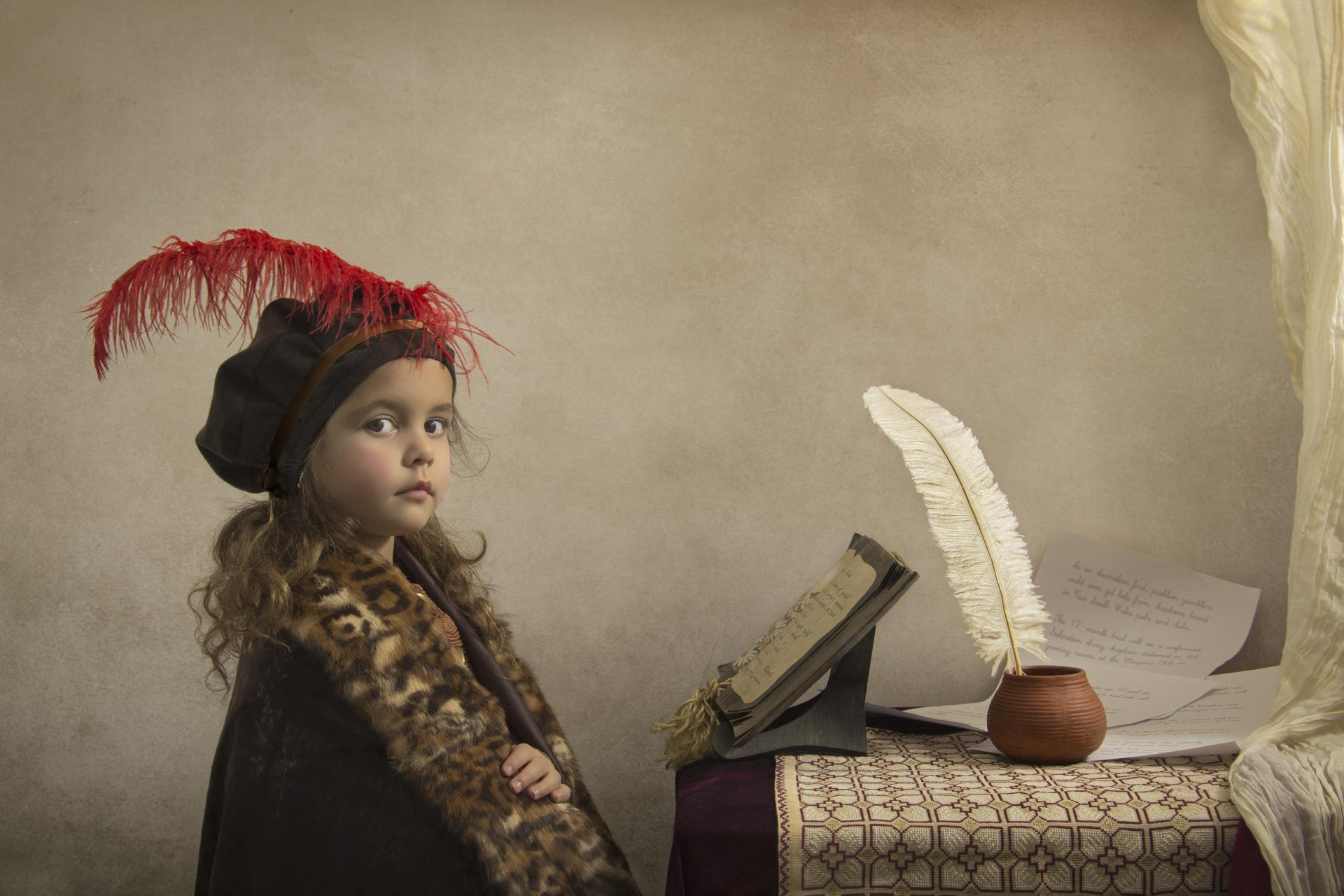 A girl in a hat with a pen and manuscripts