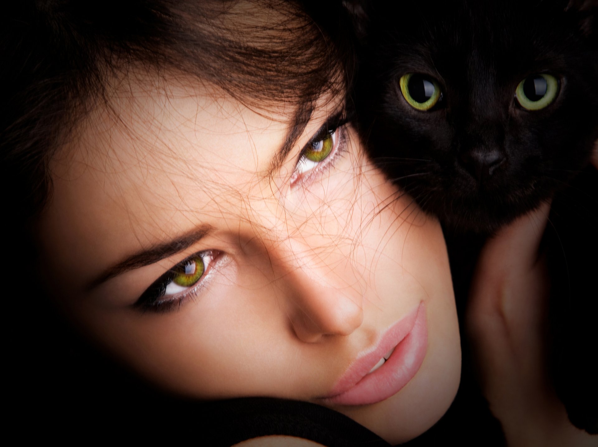 Green-eyed girl with green-eyed black cat