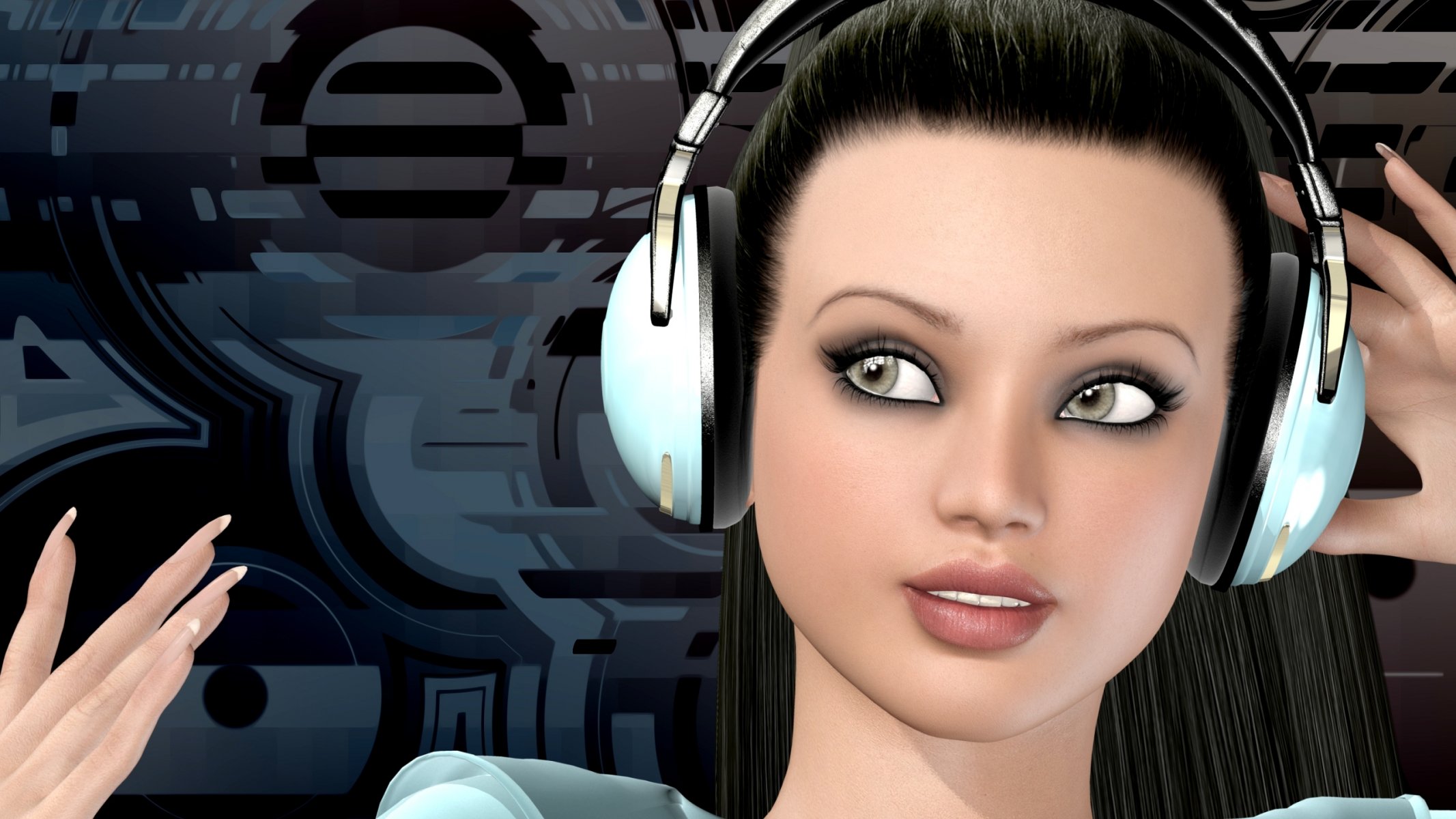 A girl with nails listens to music with headphones