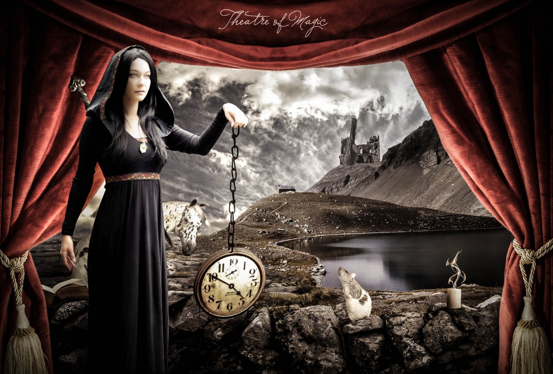 The girl with the clock next to the mouse, behind the horse