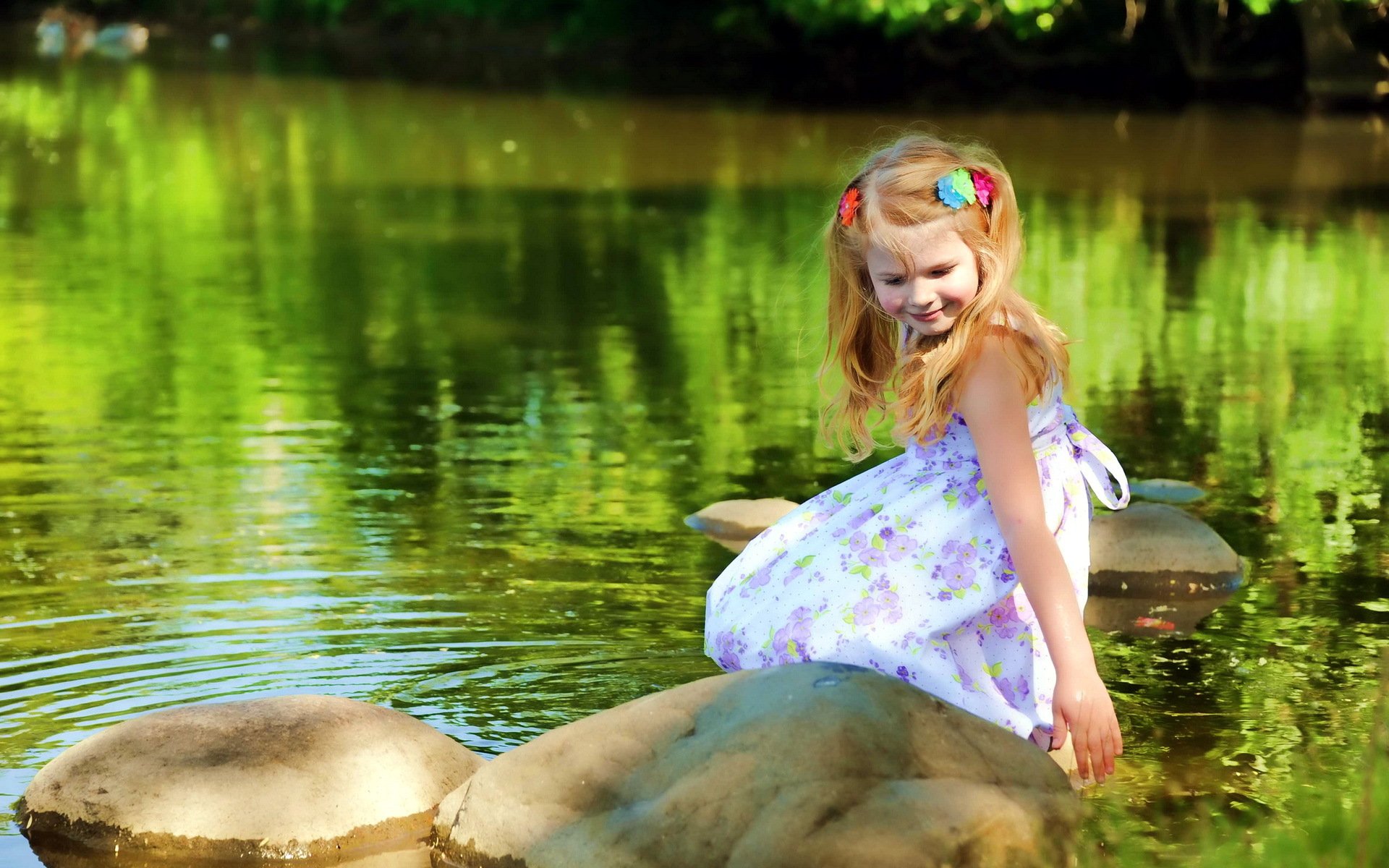 In the hot summer, it's nice to sit on a pebble by the lake, even if you're a little girl