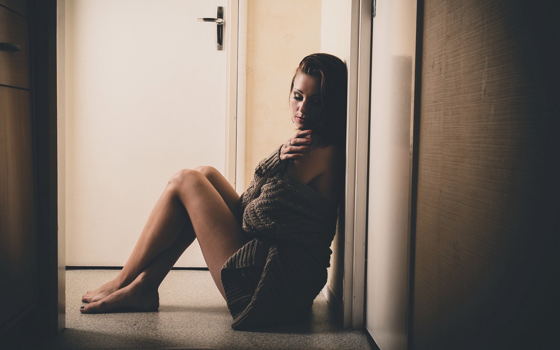 Natalie is sitting on the floor by the door
