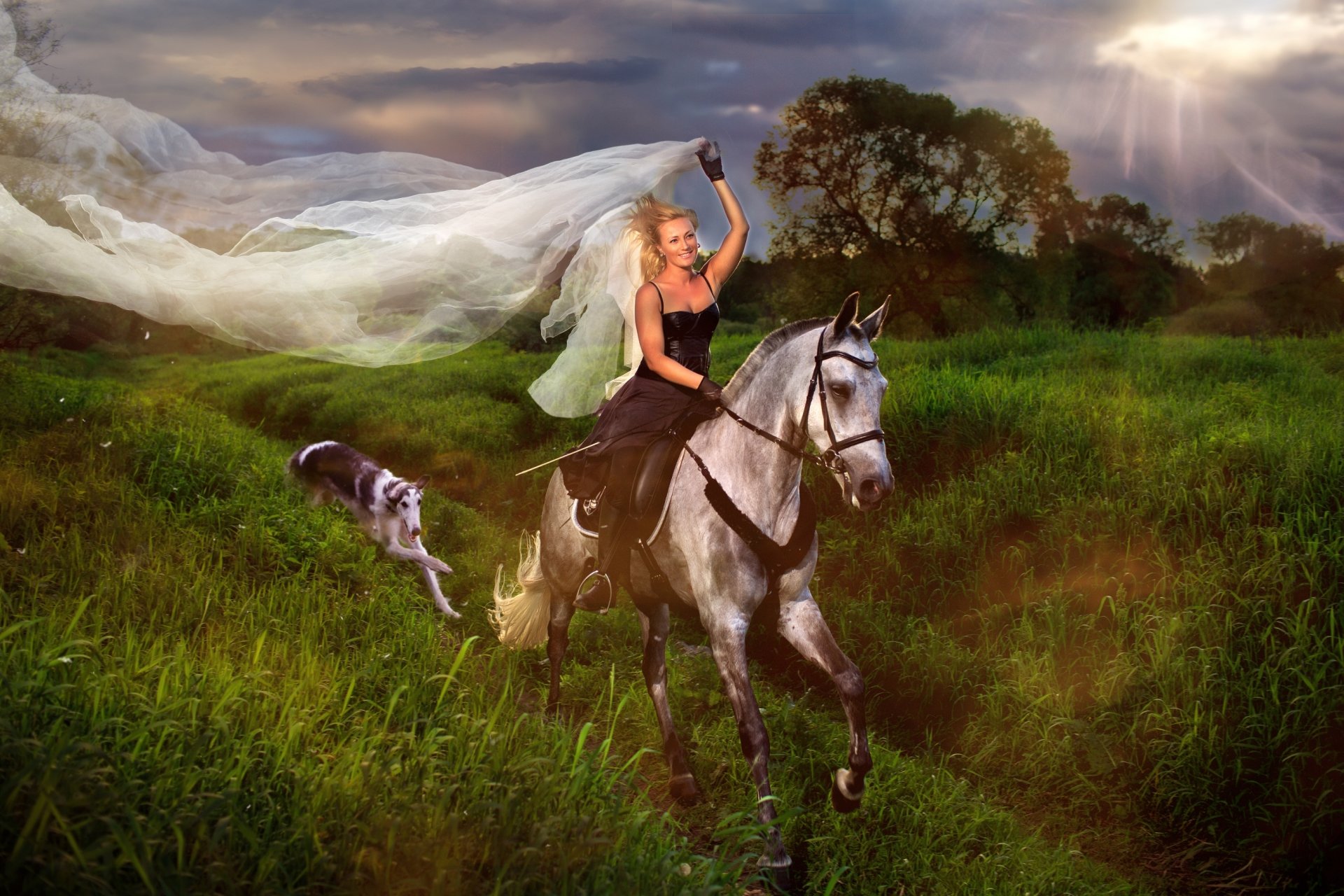 A rider with a long veil rides a horse. A greyhound dog runs after her