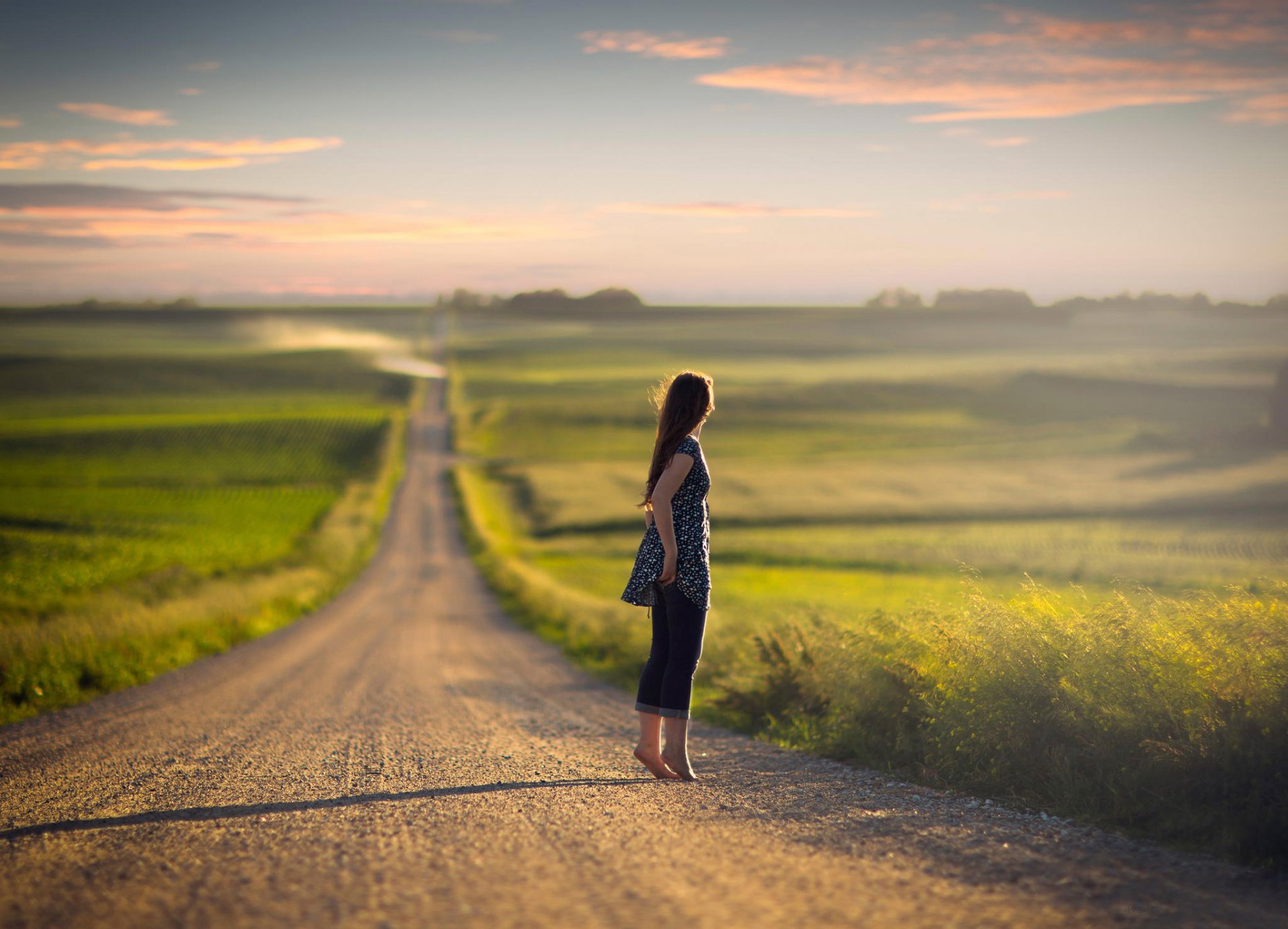 Image tags:girl, road, jeans, barefoot, space, bokeh