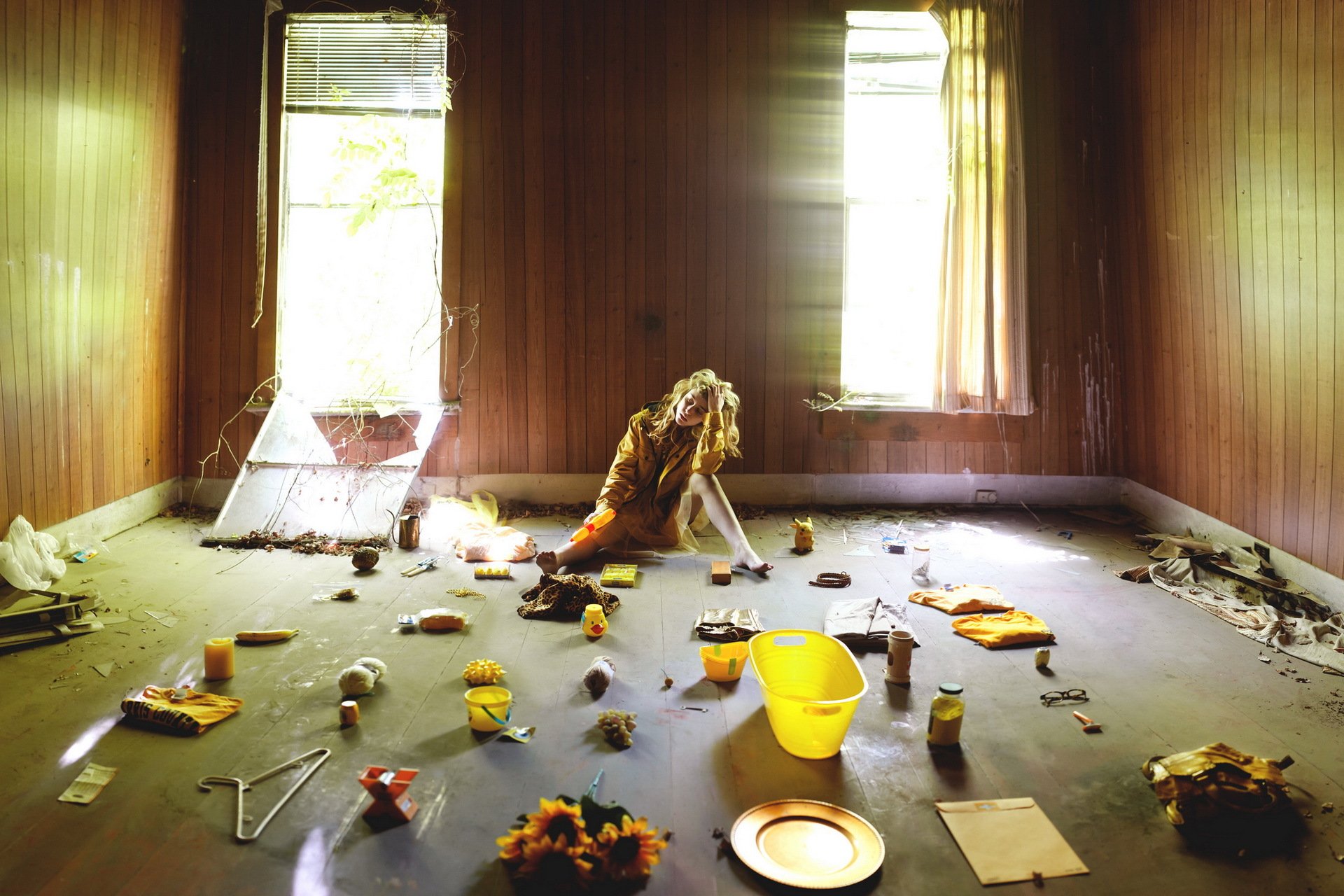 A girl with yellow wavy hair and a bow in a room with a mess and open windows