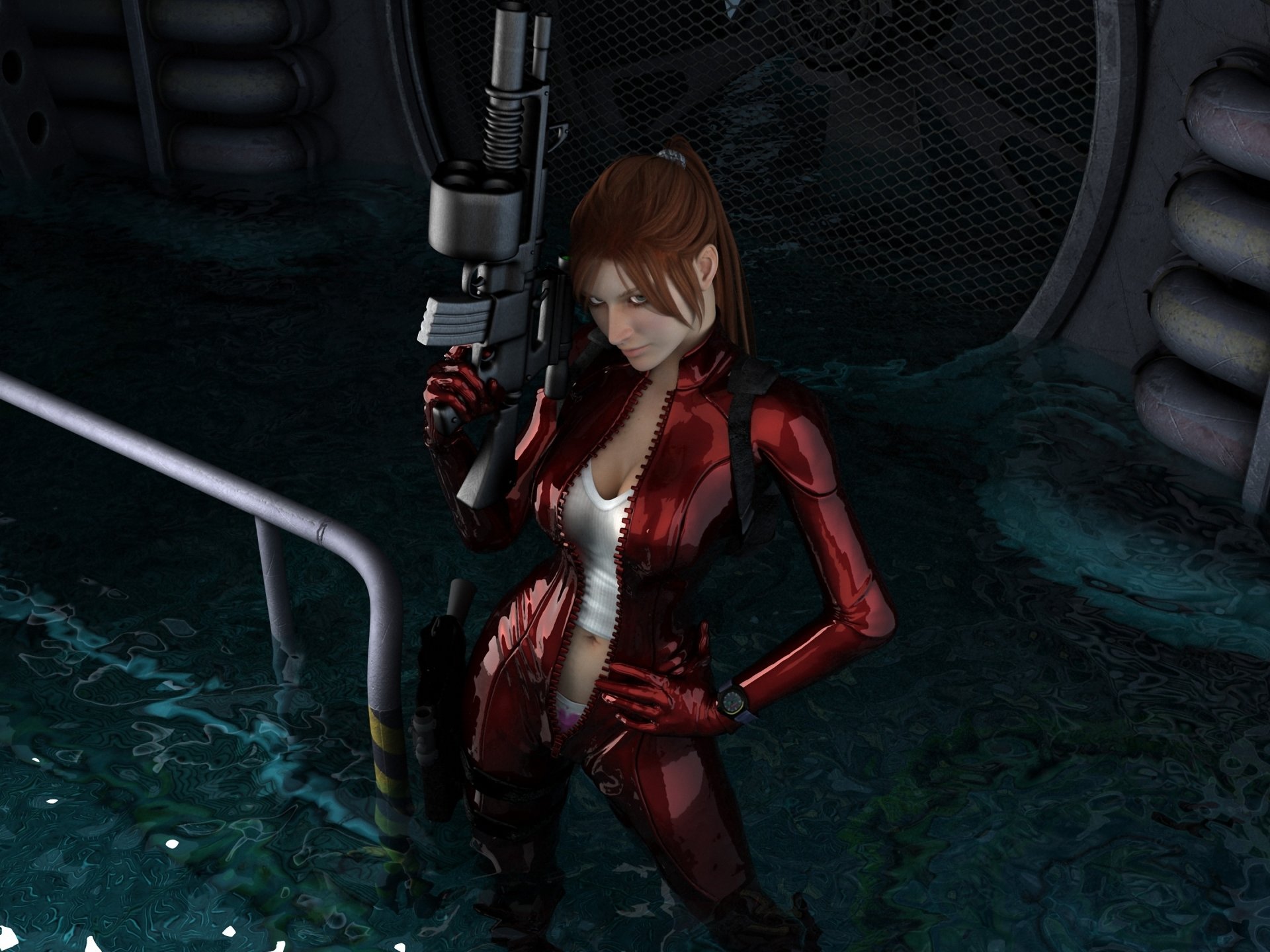 A red-haired girl in a red suit with a gun
