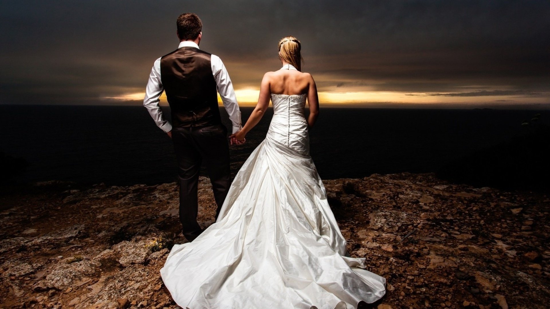 The bride and groom on the background of the evening