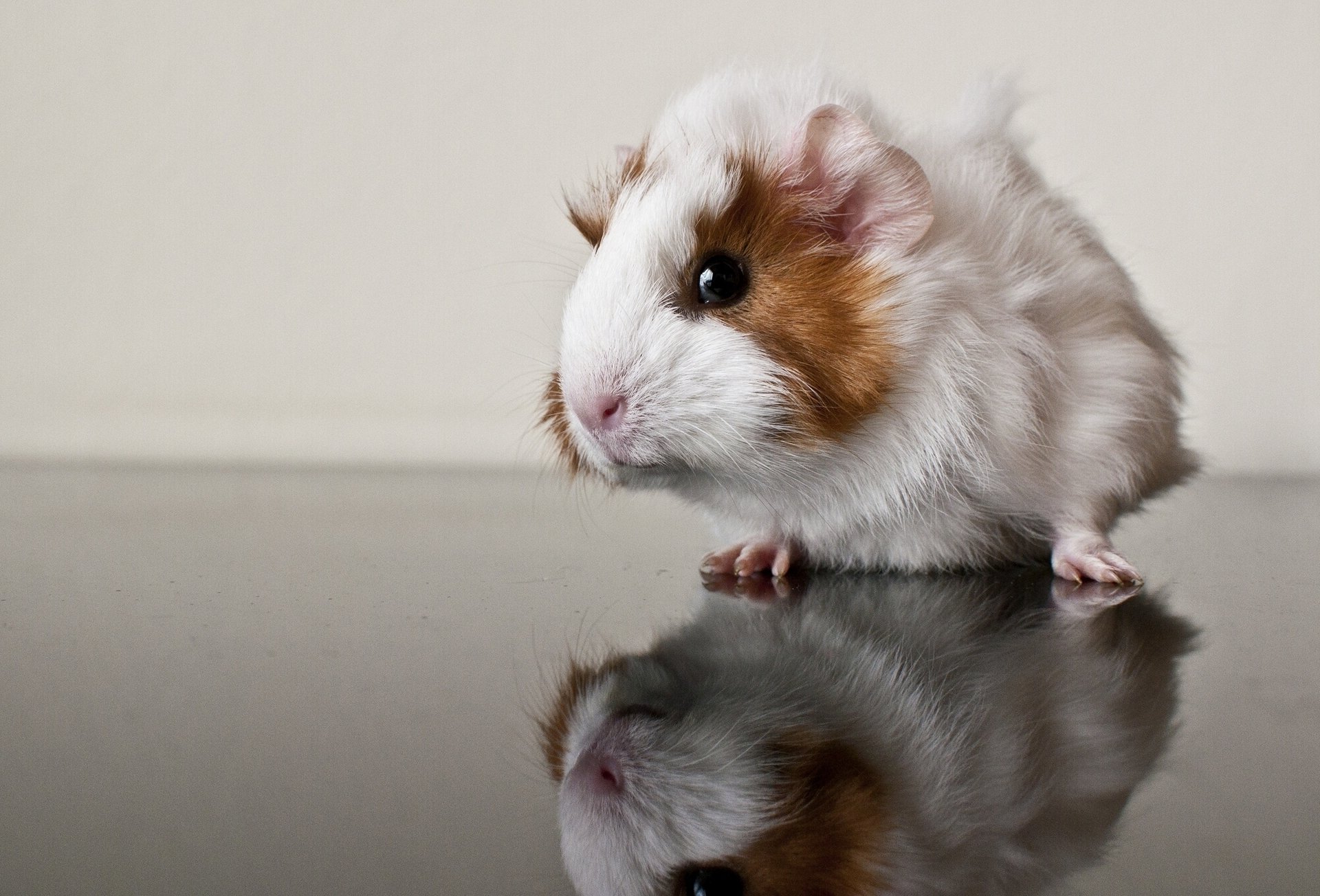A guinea pig studies a mirrored table