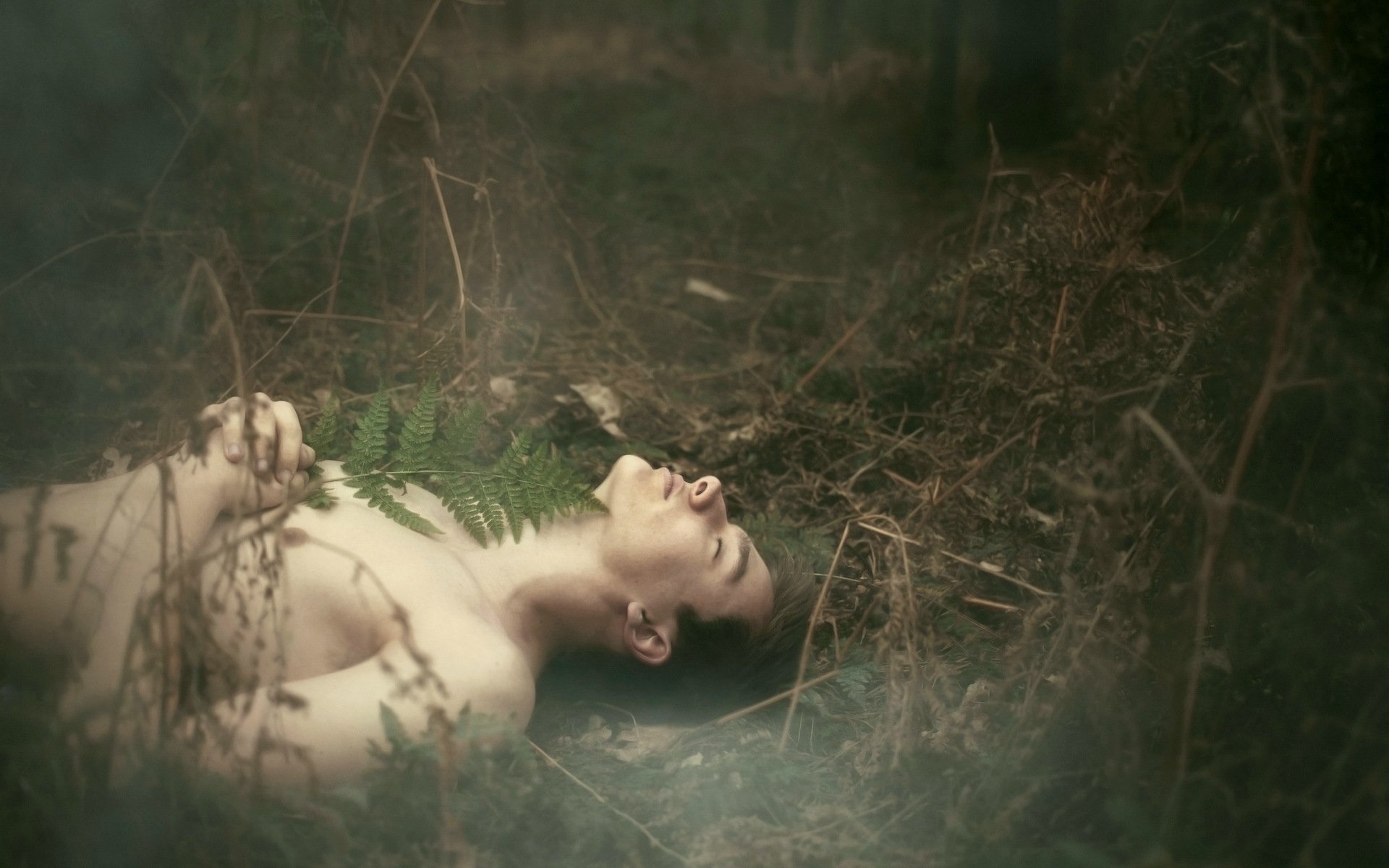 Handsome guy with a fern in the forest