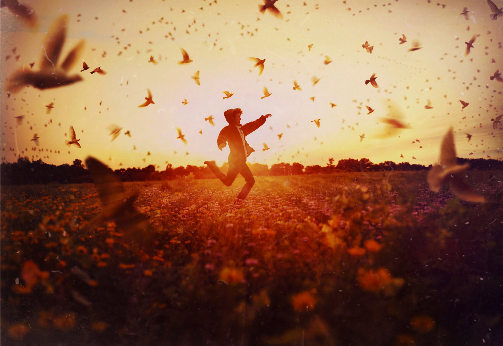 A guy, illuminated by the sun, runs across the field dispersing birds