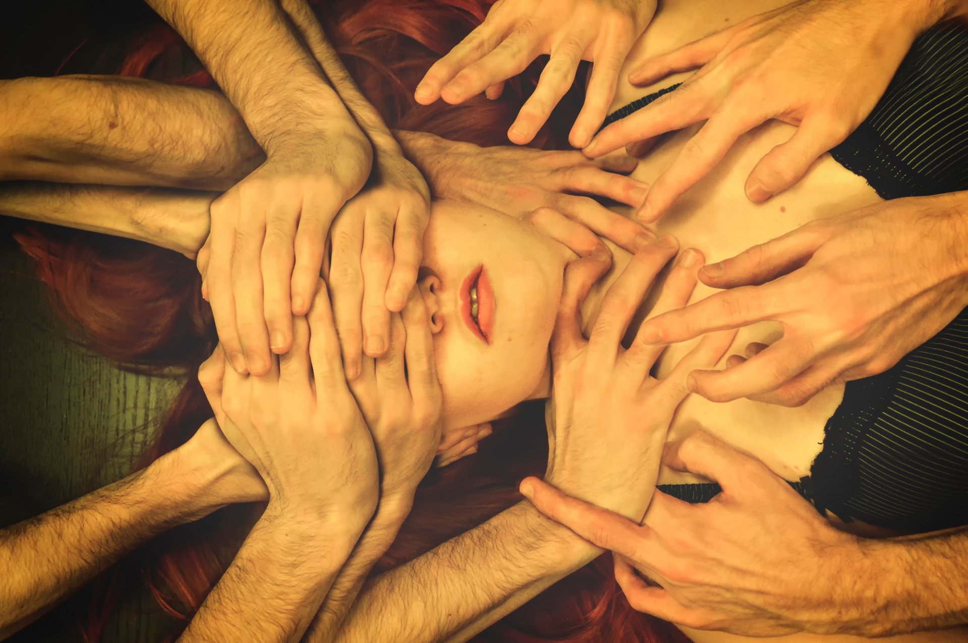Many hands covered the woman's face and neck