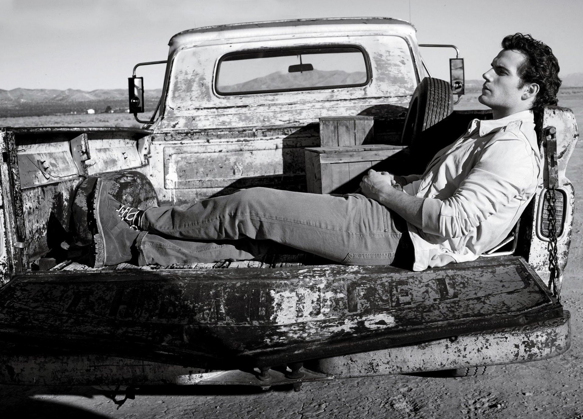 Cool actor Henry Cavill in the back of a car