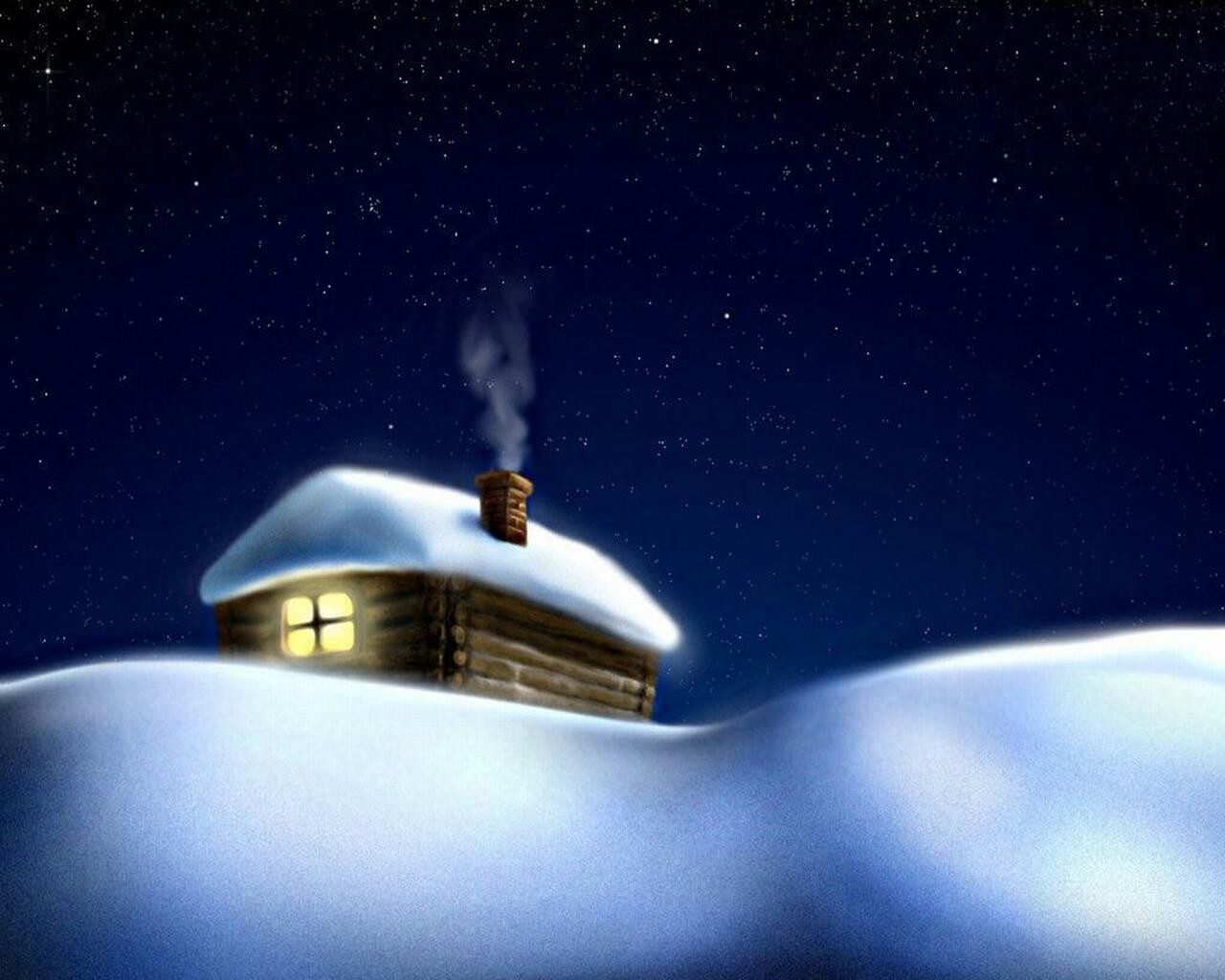 A snow-covered house with smoke from the chimney