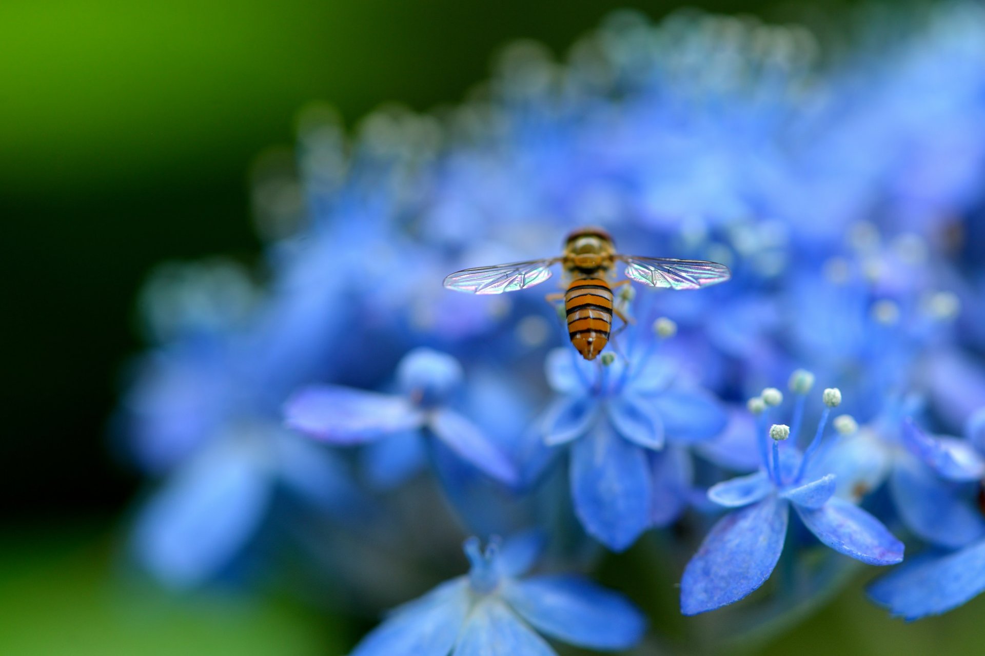 Image tags:hydrangea, blue, petals, flower, insect, close up, blur, nature
