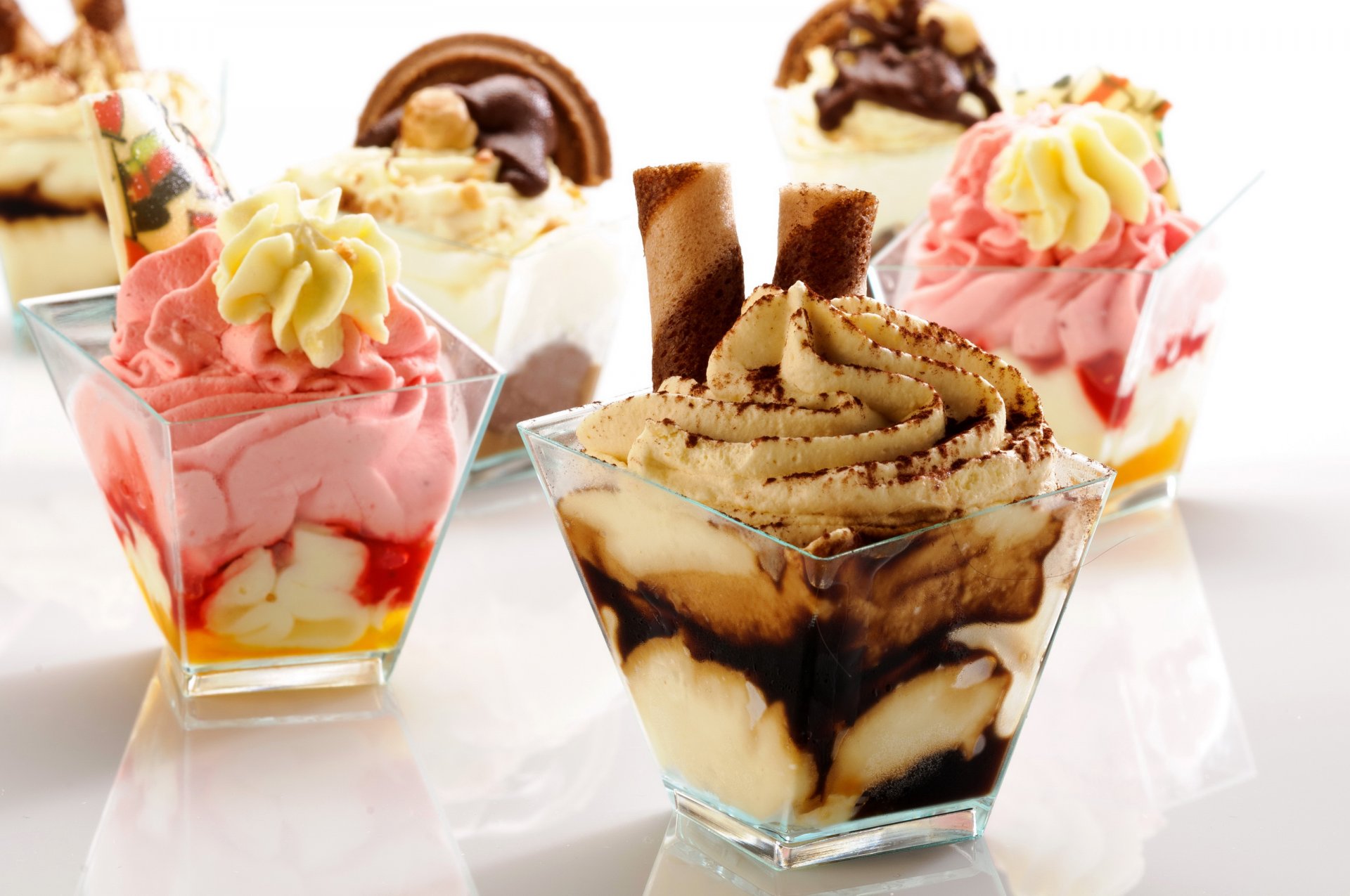 Caramel and strawberry ice cream in glass cups
