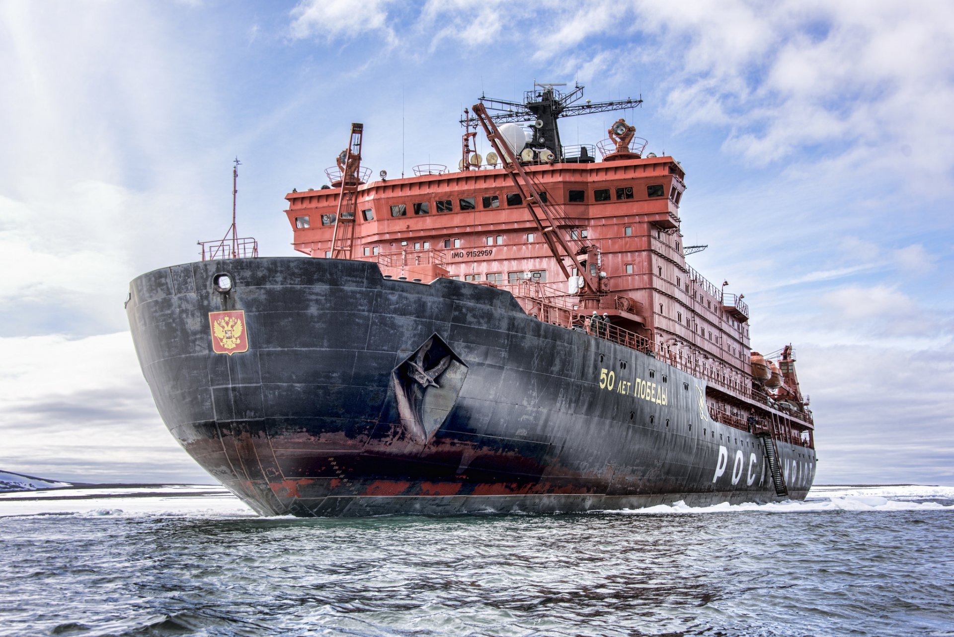 A huge icebreaker with the coat of arms of the Russian Federation