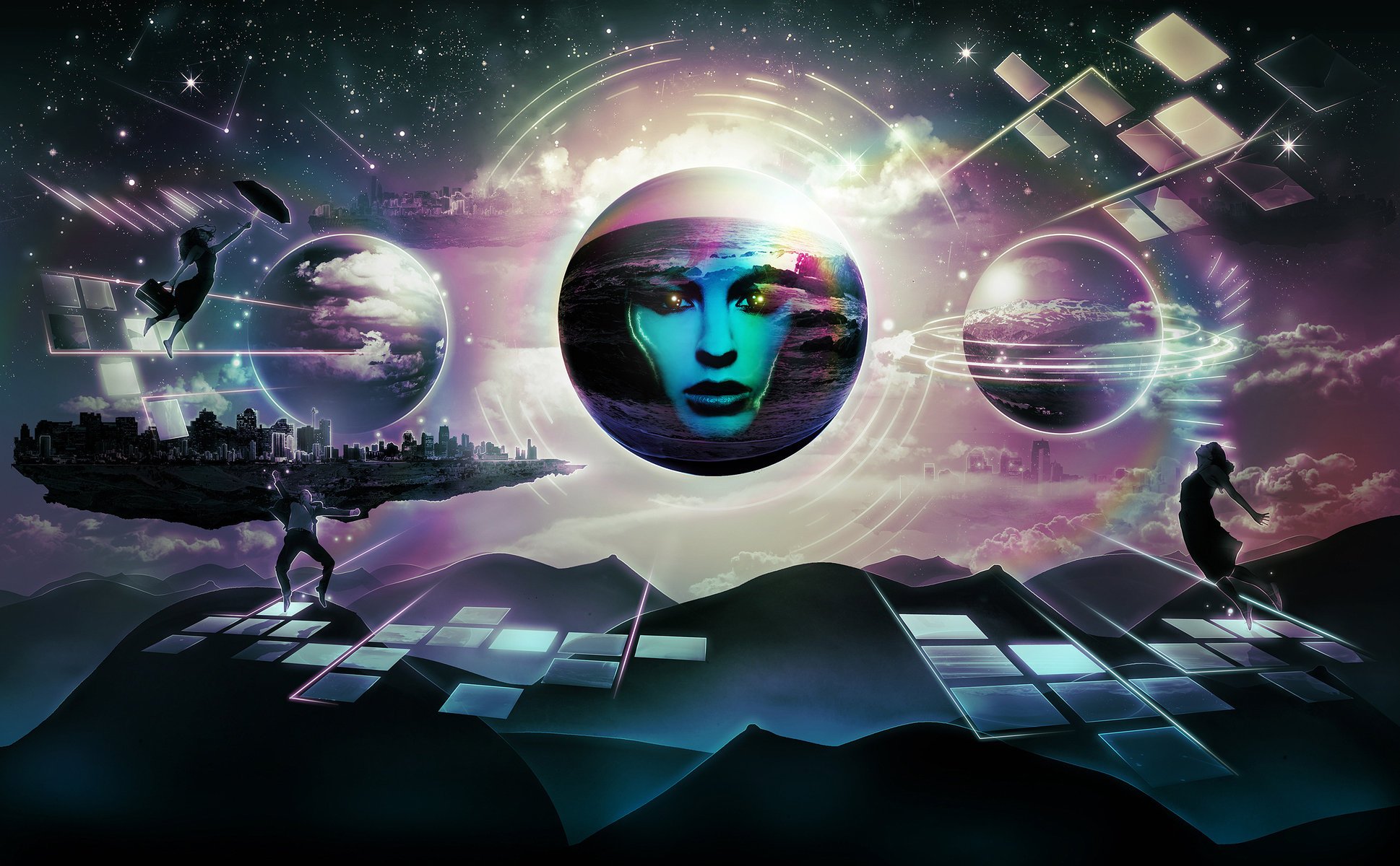 In a space cyberpunk city, a planet with a woman's face