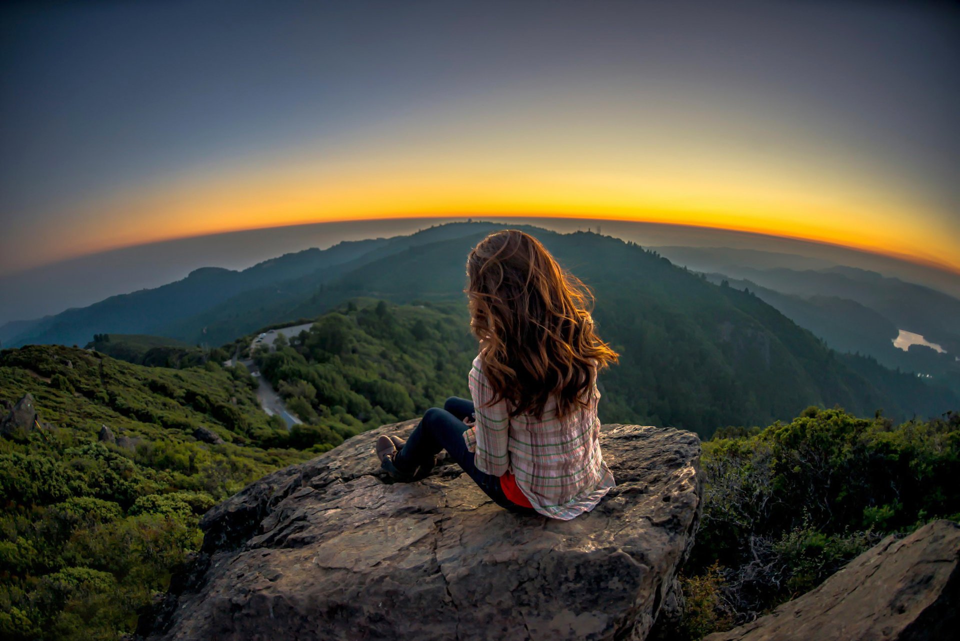 In the mountains, a stone hanging over the precipice makes it possible to see the lowland from a bird's-eye view