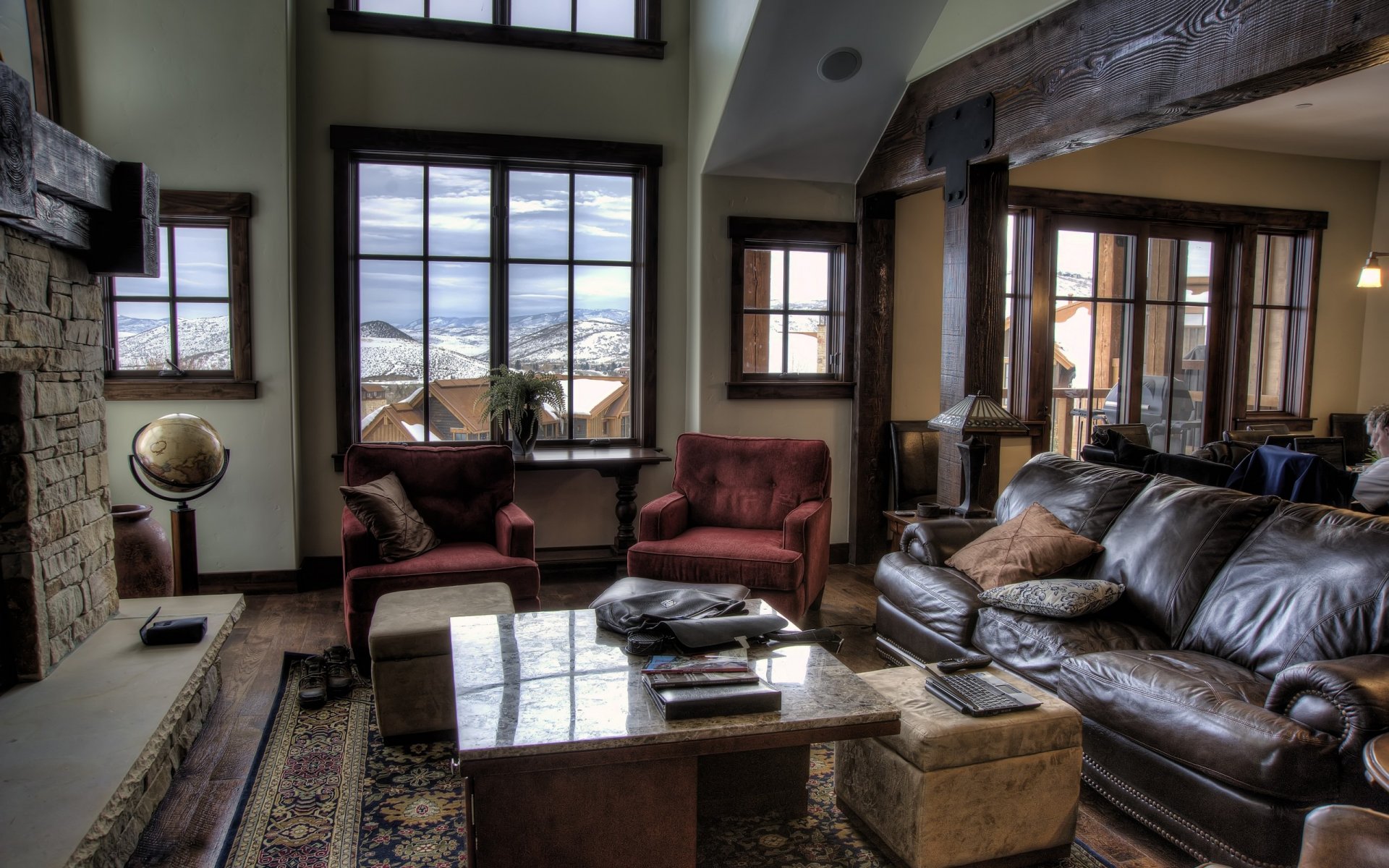 Image tags:interior, design, armchairs, table, sofa, fireplace, somewhere in the mountains