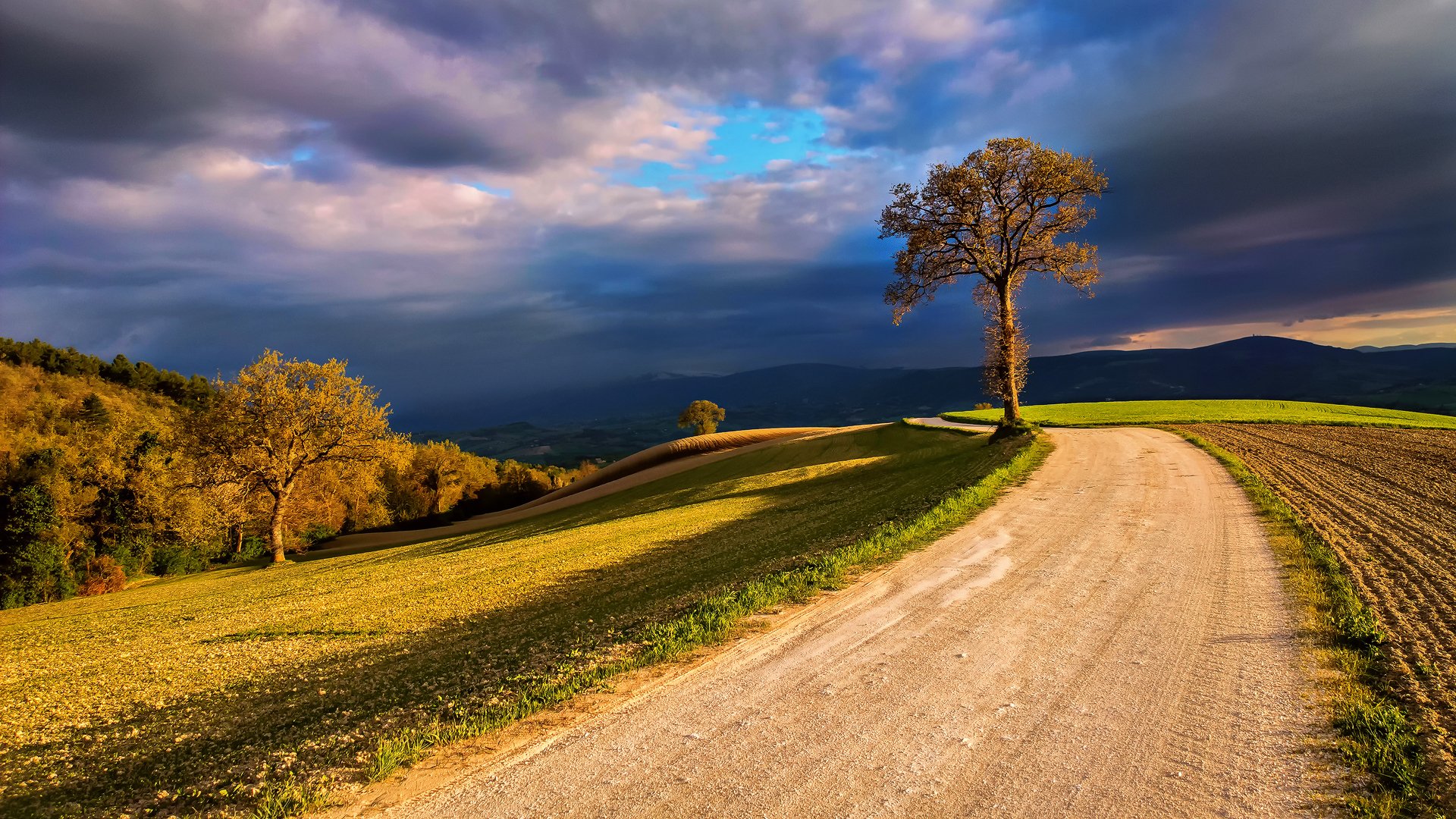 norway summer field grass tree hills green road sky clouds2048 x 1132, 688 kB