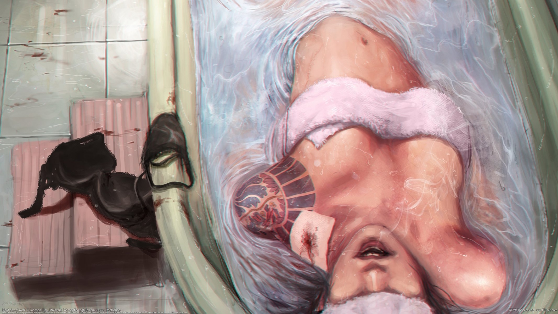 Image tags:johnson ting, girl, bath, bra, tattoos, wound