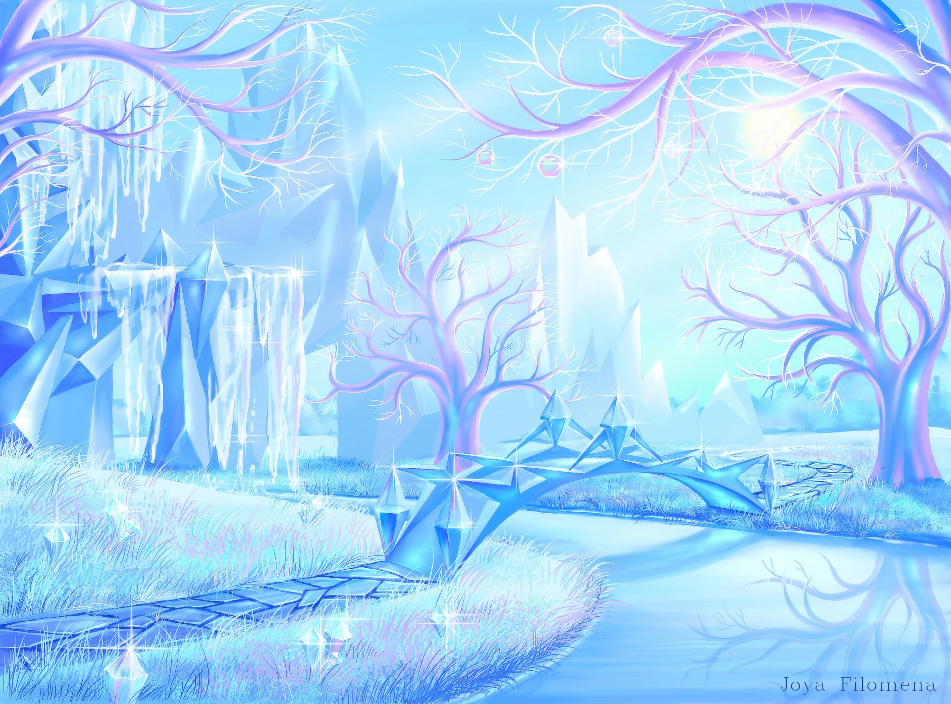 The fabulous winter forest was bound by blue ice