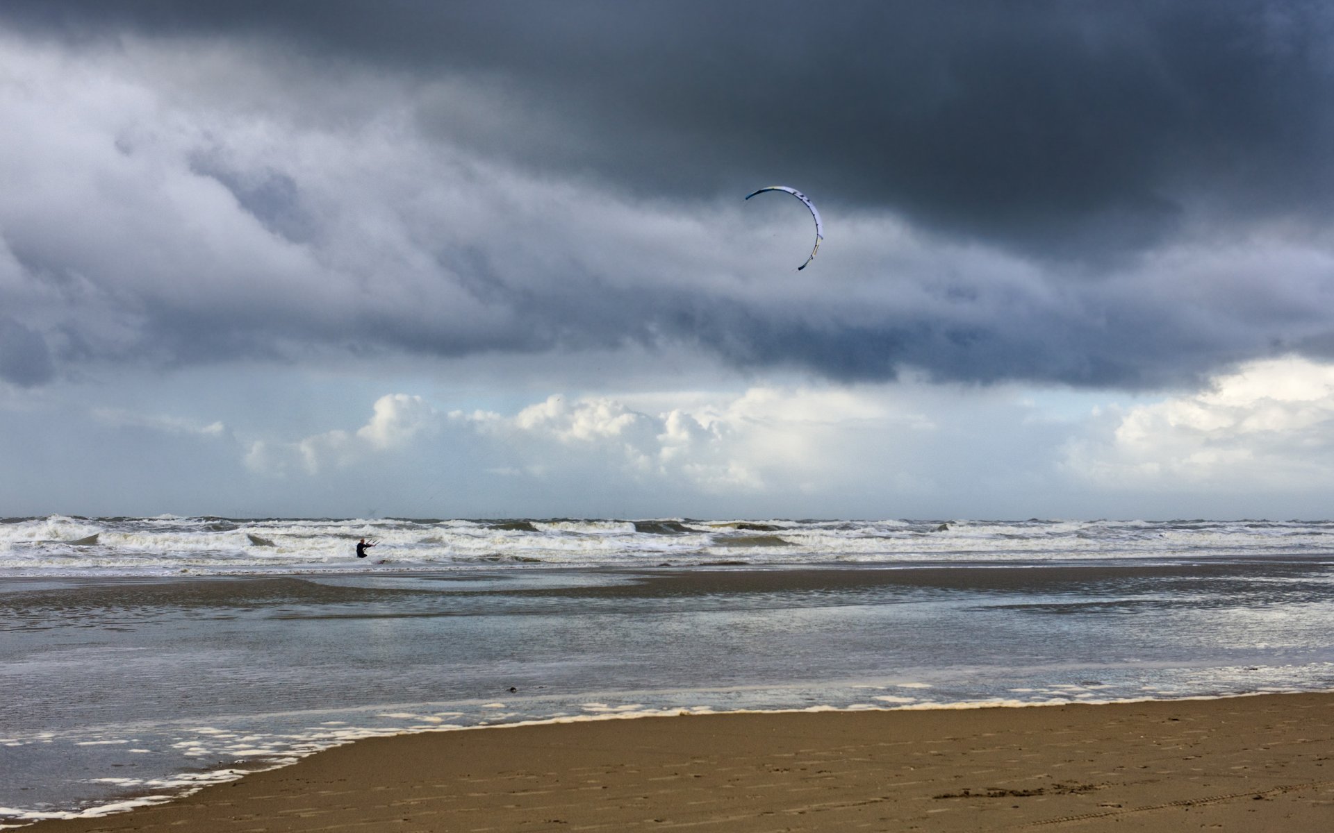 A kite surfer exercises his skills among the waves of a restless sea against a stormy sky