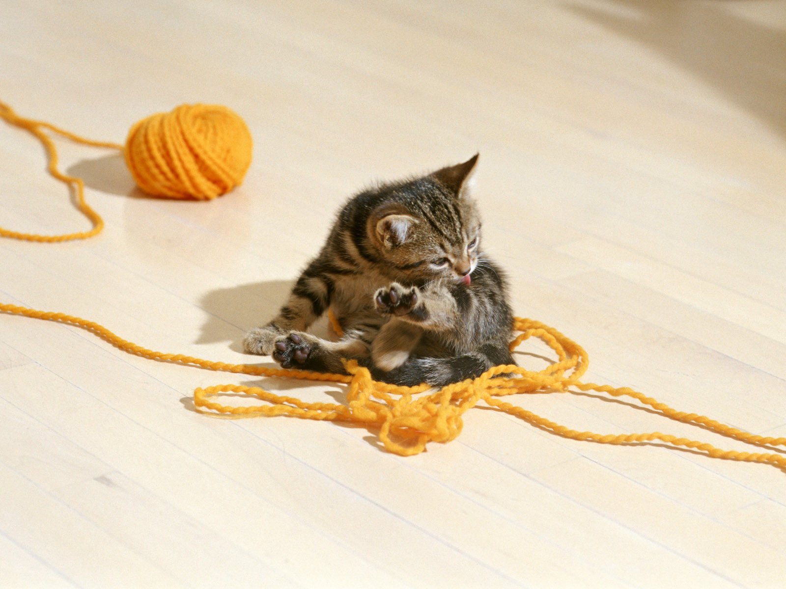 Striped kitten with a ball of thread